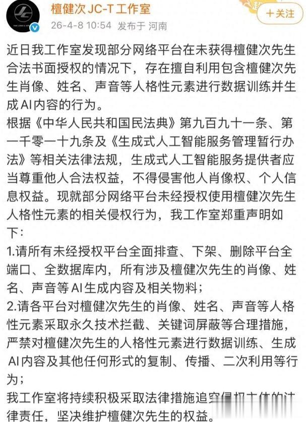 他们要求下架所有换脸的侵权内容,不能盗用明星的肖像权,明星也不是不支持这个技术,而是抵制滥用这种科技还有侵权行为。