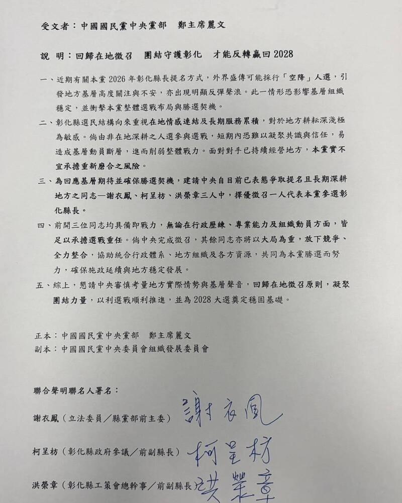 2026年台湾地区地方选举逼近,作为蓝绿必争的中台湾关键地区,彰化县长提名却成了国民党内最大“烫手山芋”。就在主席郑丽文4月12日结束访问返台、外界盛传将拍板“空降”前考纪会主委魏平政之际,党内最早表态争取提名的立委谢衣凤、县府参议柯呈枋、工策会总干事洪荣章,于11日深夜联手发出重磅连署声明,公开要求蓝营中央“回归在地征召”,从3人中择优1人出战,剑指高层“密室作业”,蓝营内斗彻底白热化 。