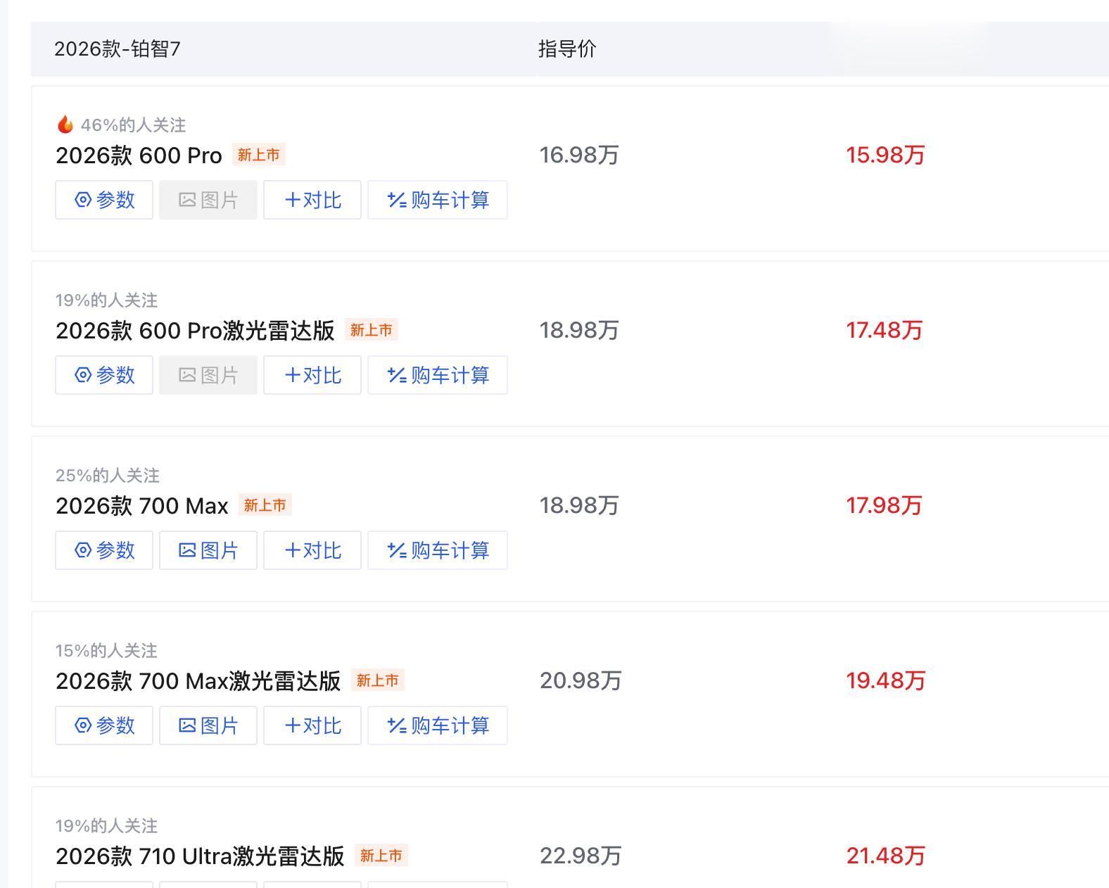 铂智7一共五个版本,但核心逻辑很清晰:价格一步到位,配置按需选择。