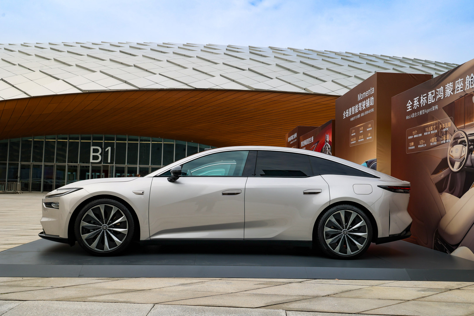 第一眼看到铂智7,最直观的感受就是“大”,这已经是一个标准的中大型轿车尺寸了。把它和比亚迪汉、小米SU7这些车停在一起,气场上是完全不虚的。
