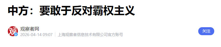 中方:要敢于反对霸权主义 观察者网 2026-04-14 09:07 上海观察者信息技术有限公司官方账号