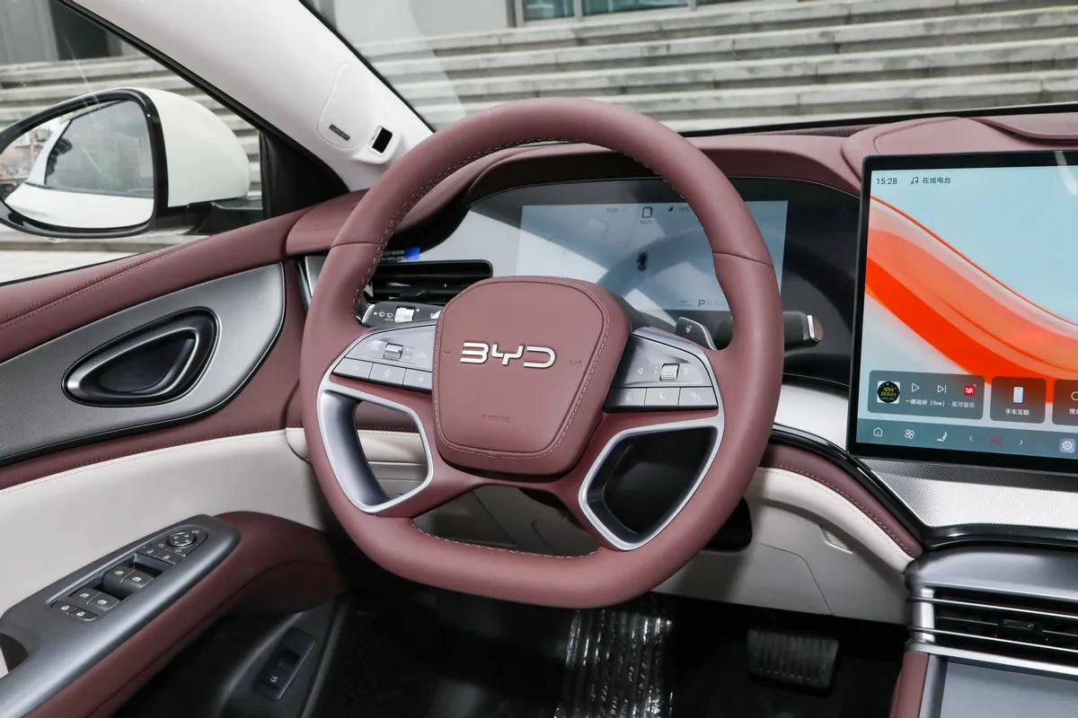 环抱式仪表台设计,温馨又踏实,我们试驾的是美态香红内饰,色调热情大方,老婆一坐进来就喜欢,说看着喜庆又有活力,整车档次一下子就上来了。座椅采用皮质包裹,关键区域做了打孔处理,透气性超好,长时间坐着也不闷汗,门板内侧全是软质材料,手感细腻,用料实在,摸得到的地方都很舒服。车内三屏联动设计,用起来顺手又方便,10.25英寸全液晶仪表,清晰显示车辆信息、续航里程、导航路线,一目了然。我们从市区4S店出发,绕着汾河公园、晋阳湖转了一圈,往返大概30公里,表显续航消耗跟实际里程几乎一致,续航扎实不打折,完全没有虚标。其实让我惊喜的是补能效率,海豹07EV搭载第二代刀片磷酸铁锂电池,69.07kWh容量,CLTC续航705km,官方数据10%充到70%仅需5分钟,充至97%只要9分钟,低温环境下(-20℃)也只要约12分钟。试驾结束后,我特意去充电站试了试,真的就是喝杯水、聊几句天的功夫,电量就从10%冲到了70%,比加油还利索,彻底告别纯电车续航焦虑。以后清明去五台山、五一去平遥古城,中途根本不用花大把时间等充电,说走就走,太省心了。
