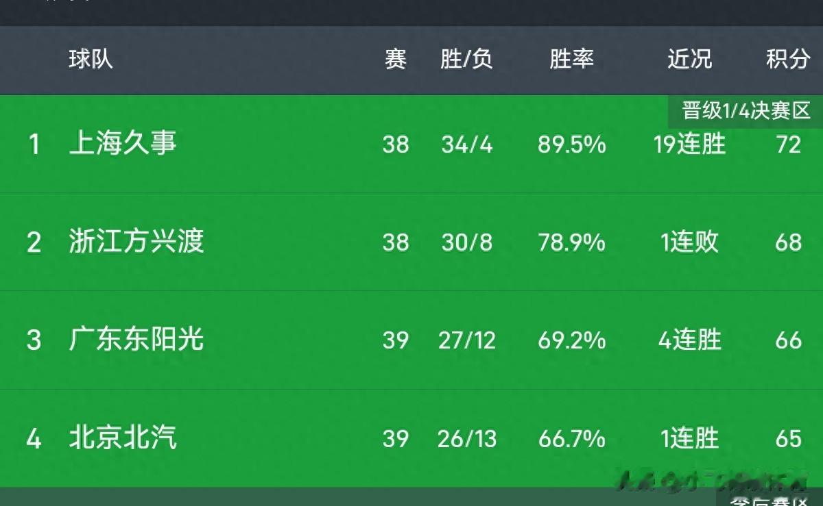 广东队目前27胜12负,占据积分榜第三名的位置,不出意外,剩下的三场比赛分别对阵福建两次 山西一次,广东最后的成绩将会是30胜12负,排名第三晋级季后赛!