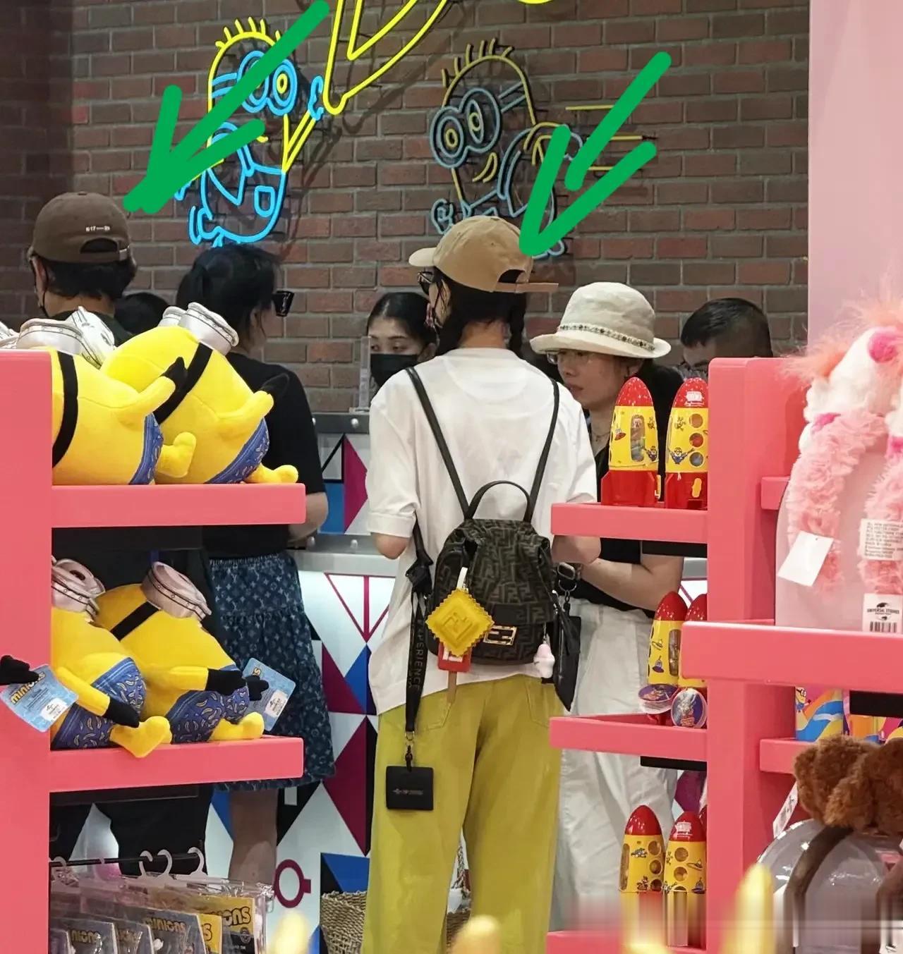 在买纪念品时,罗晋负责排队结账,唐嫣在一旁等着。