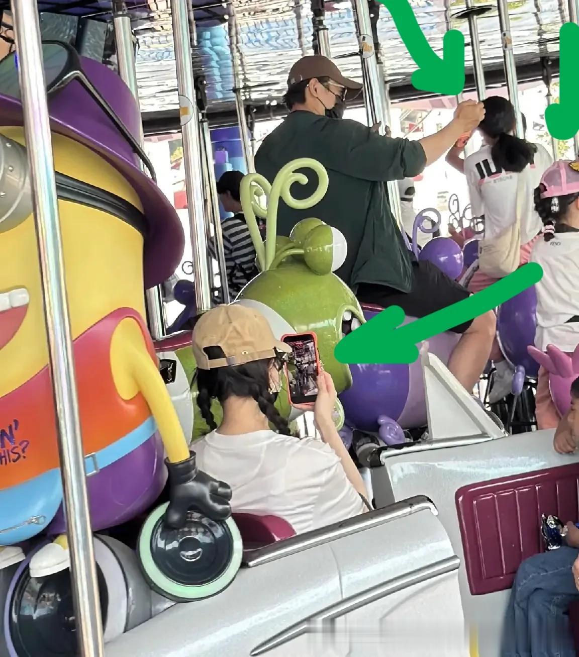 在乘坐旋转木马时,罗晋在帮“小小糖”拍照,而坐在后面的唐嫣,却在认真地拍着父女俩。