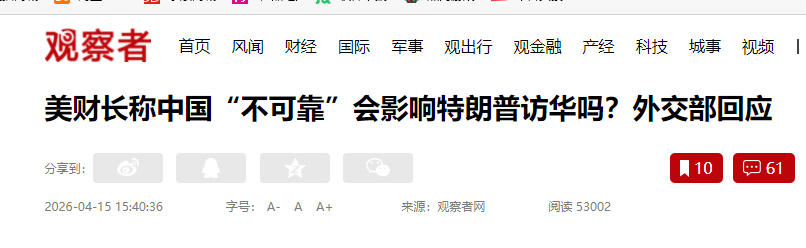 美财长称中国“不可靠”会影响特朗普访华吗?外交部回应 2026-04-15 15:40:13 19:19观察者网