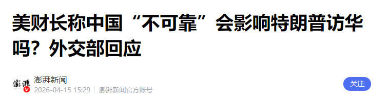 美财长称中国“不可靠”会影响特朗普访华吗?外交部回应 澎湃新闻 2026-04-15 15:29 澎湃新闻官方账号