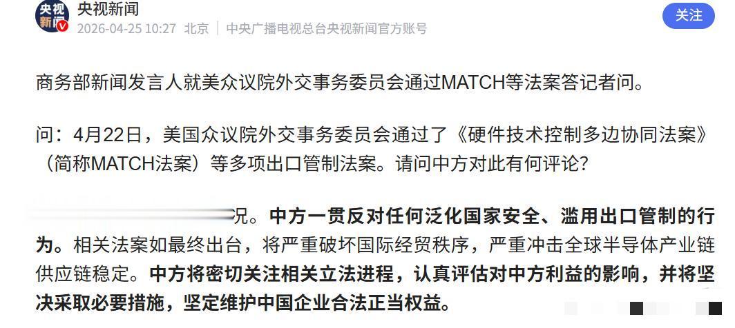 4月22日,美国众议院外交事务委员会以全票赞成的结果通过了该法案,其全称为《硬件技术控制多边协同法案》,核心目标直指中国半导体产业。