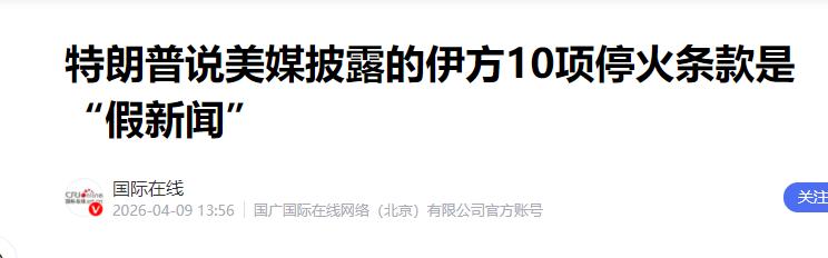 可谁能想到,短短两天后,4月8日,特朗普直接在社交平台“自爆”,公开否认媒体报道的伊朗“10项停火条款”,骂这是“完全虚假、捏造的骗局”。