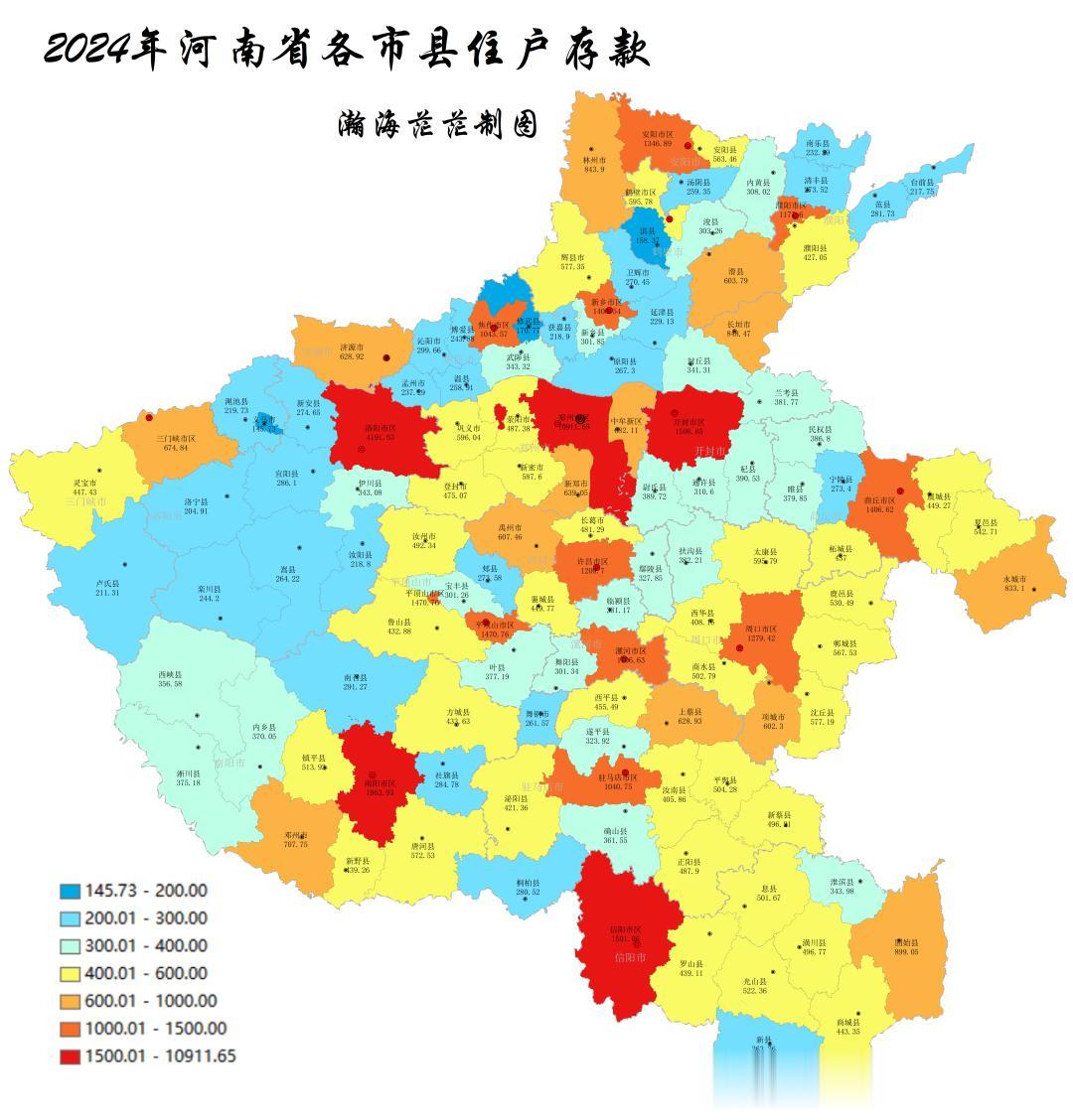 2024年,在河南省103个县市和17个地市市区中,住户存款最高的是郑州市区,达到了10911.65亿,是全省唯一一个超过万亿的地方。