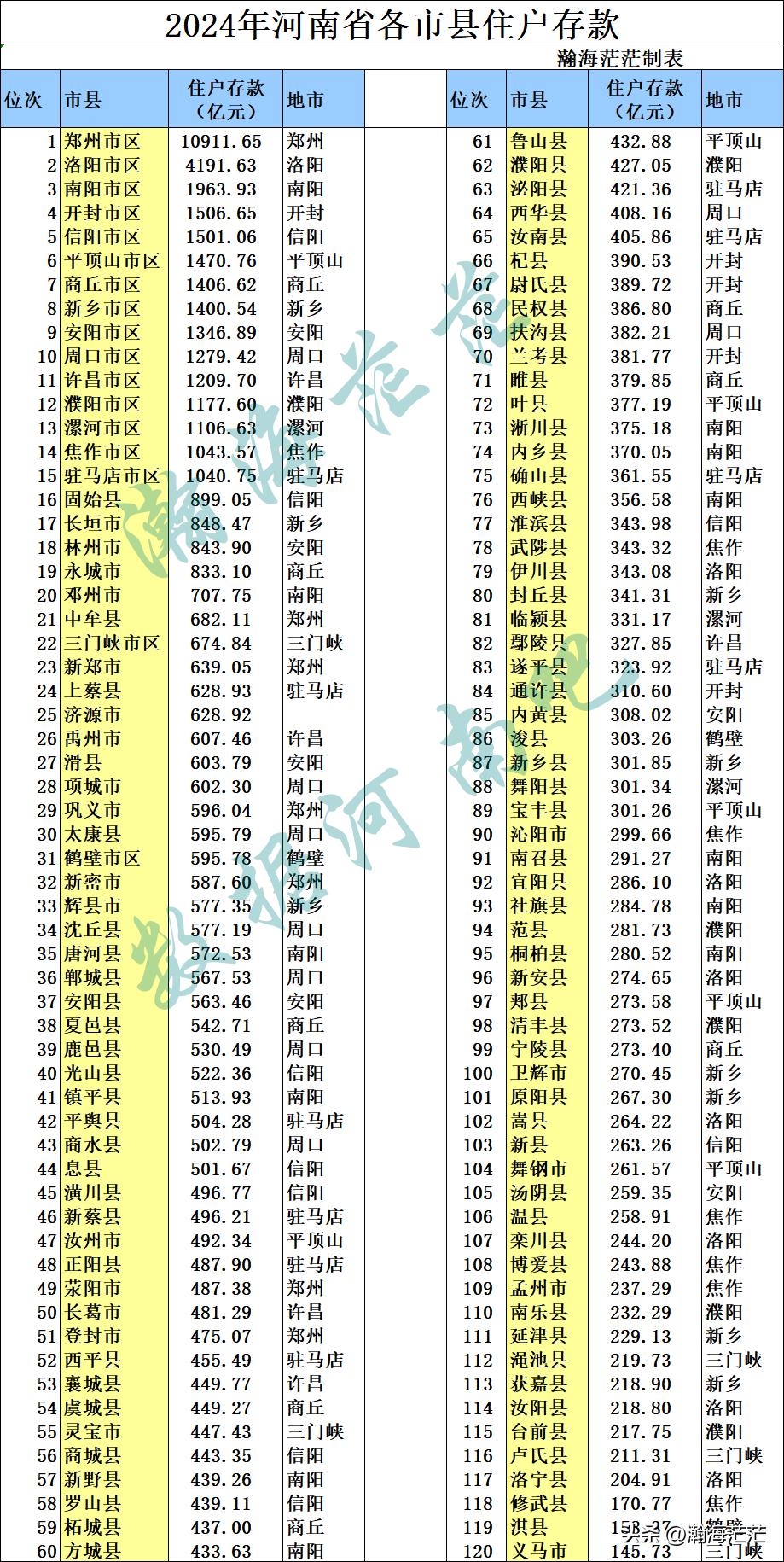 如果你需要2024年河南省120个市县住户存款详细数据,请看下面图表: