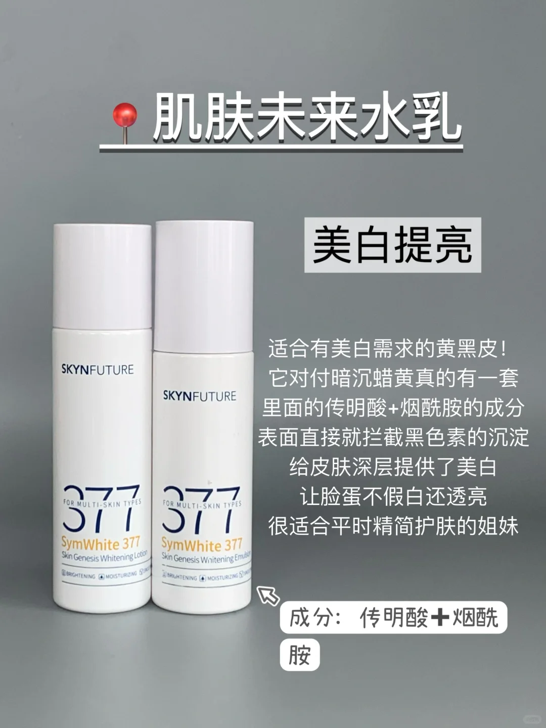 适合有美白需求的黄黑皮!它对付暗沉蜡黄真的有一套,里面的传明酸+烟酰胺的成分,在表面直接就拦截黑色素的沉淀,给皮肤深层提供了美白,让脸蛋不假白还透亮,很适合平时精简护肤的姐妹,美白保湿一步到位~