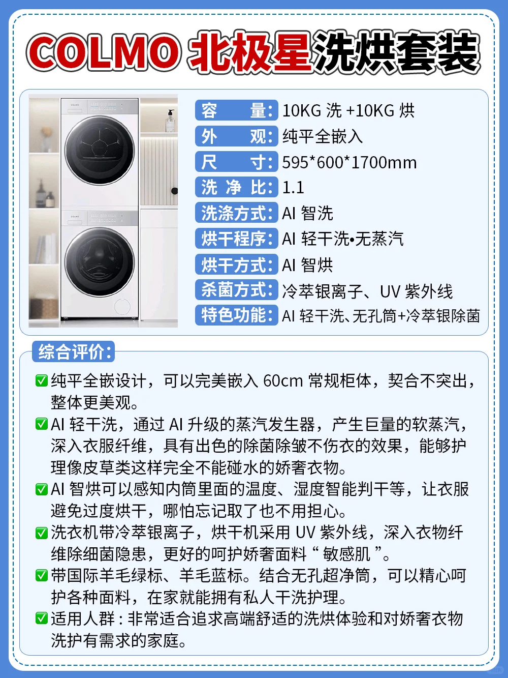🔹经过详细测评对比,我觉得✨COLMO 北极星洗烘套装不仅功能强大,洗烘护理方面也专业,能满足对衣物洗护的所有需求。