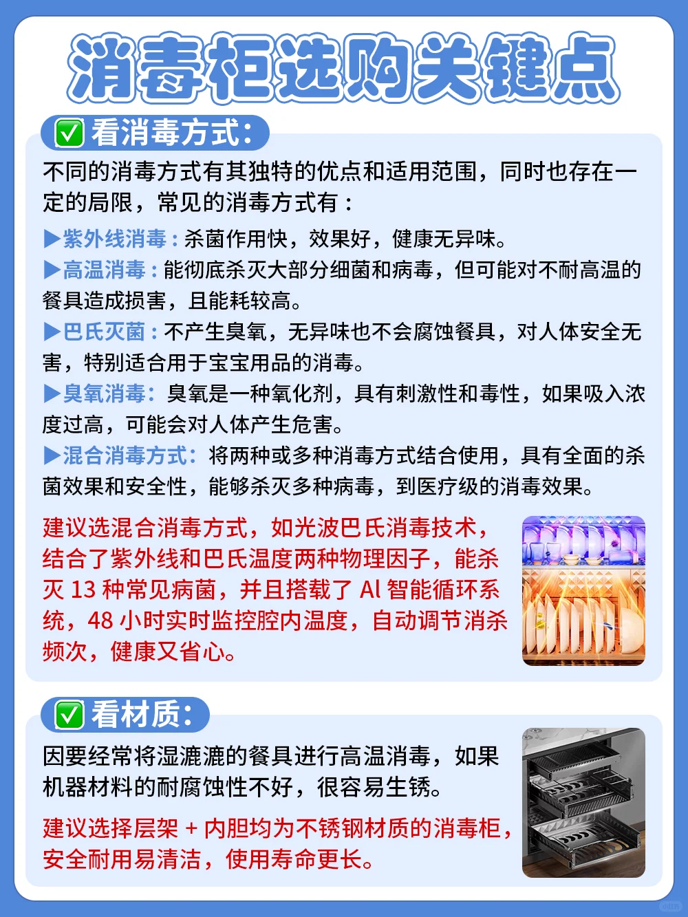建议选择层架+内胆均为不锈钢材质的消毒柜,安全耐用易清洁,使用寿命更长。