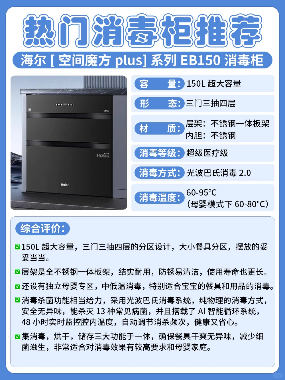 经过详细对比,我家入手了海尔EB150消毒柜,消毒杀菌相当给力,它采用了光波巴氏消毒系统,搭配Al智能循环消毒,用起来超安心,还有独立烘干和一键母婴模式,完全满足了我使用需求,追求高性价比和高效杀菌的,选它准没错啦。