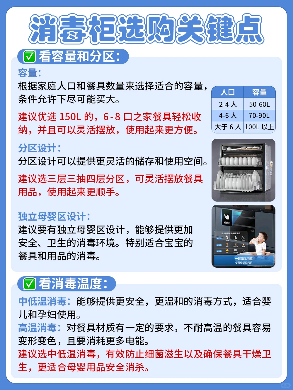 建议有独立母婴区设计,能够提供更加安全、卫生的消毒环境。特别适合宝宝的餐具和用品的消毒。