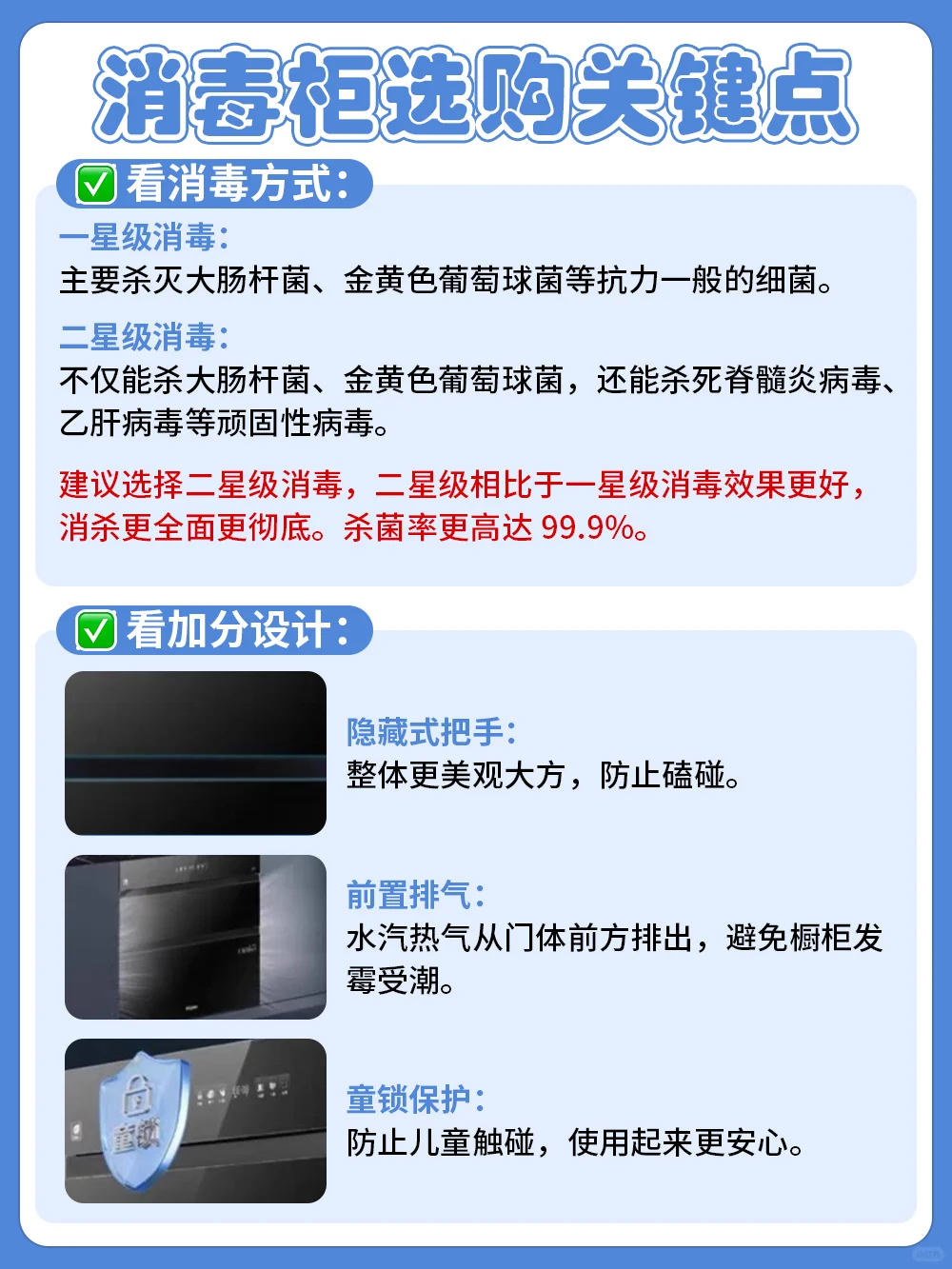 建议选择二星级消毒,二星级相比于一星级消毒效果更好,消杀更全面更彻底。杀菌率更是高达99.99%。