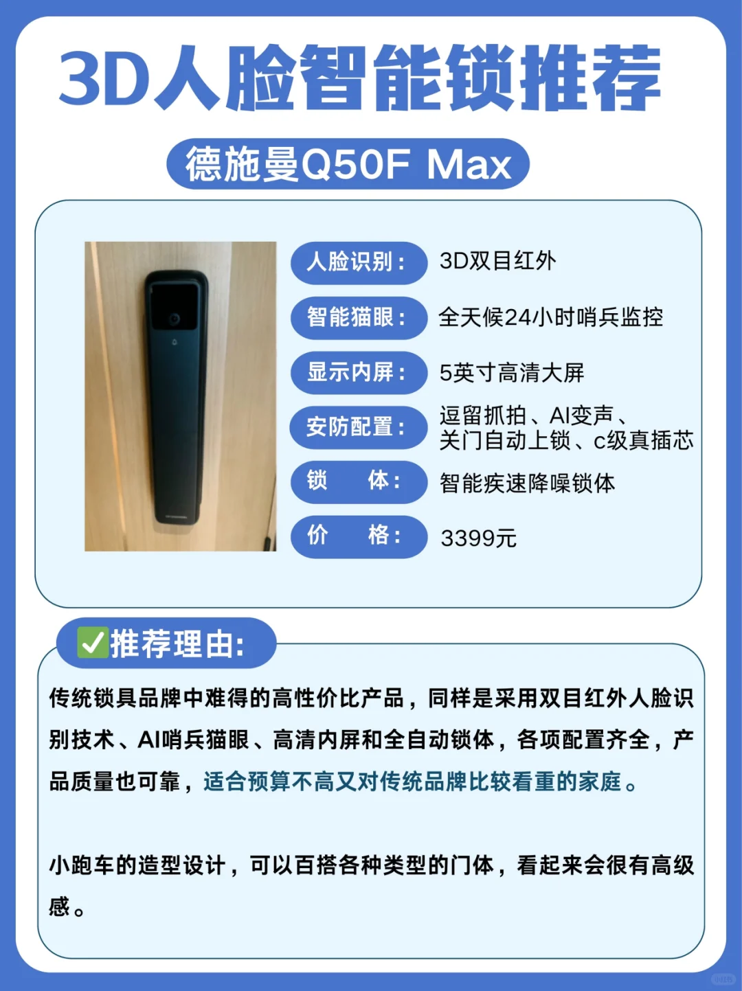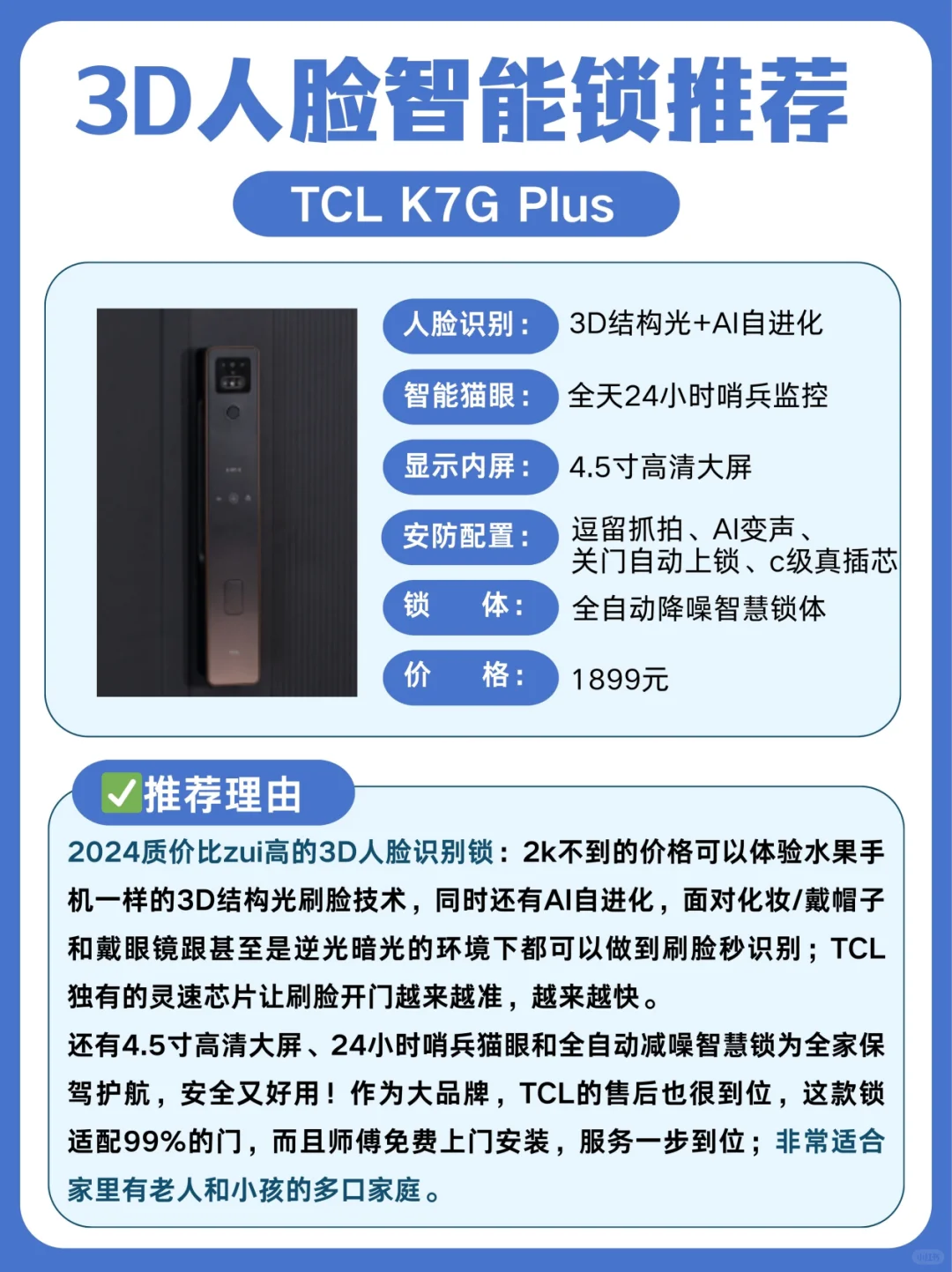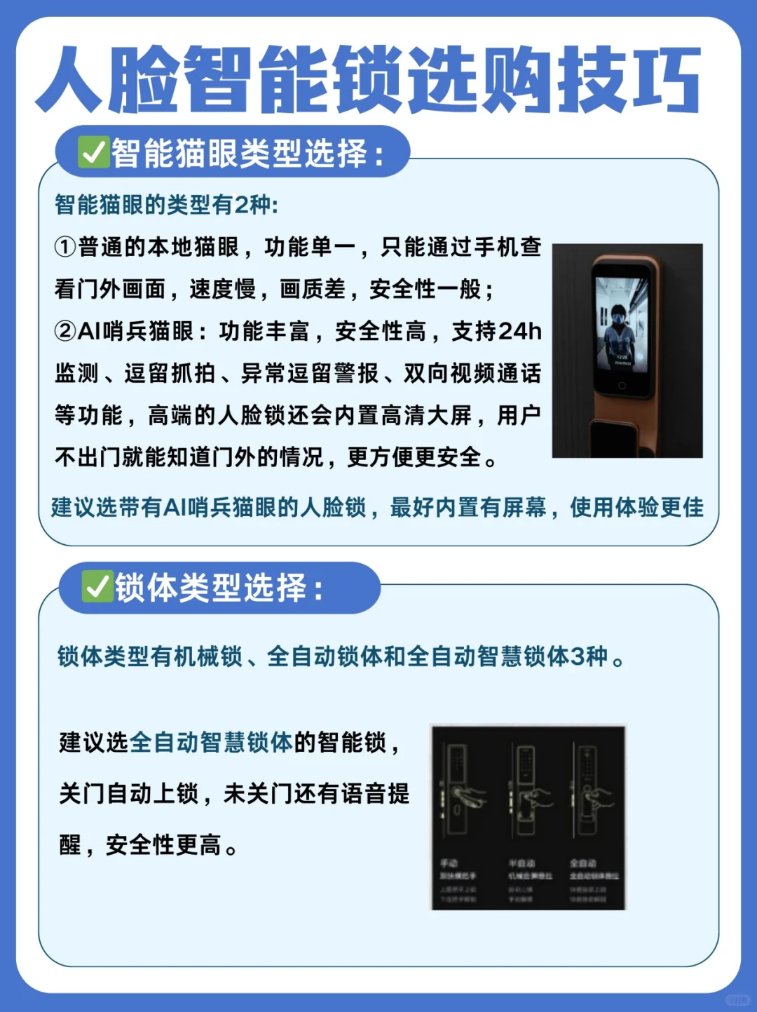 🔷建议选全自动智慧锁体的智能锁,关门自动上锁,未关门还有语音提醒,安全性更高。