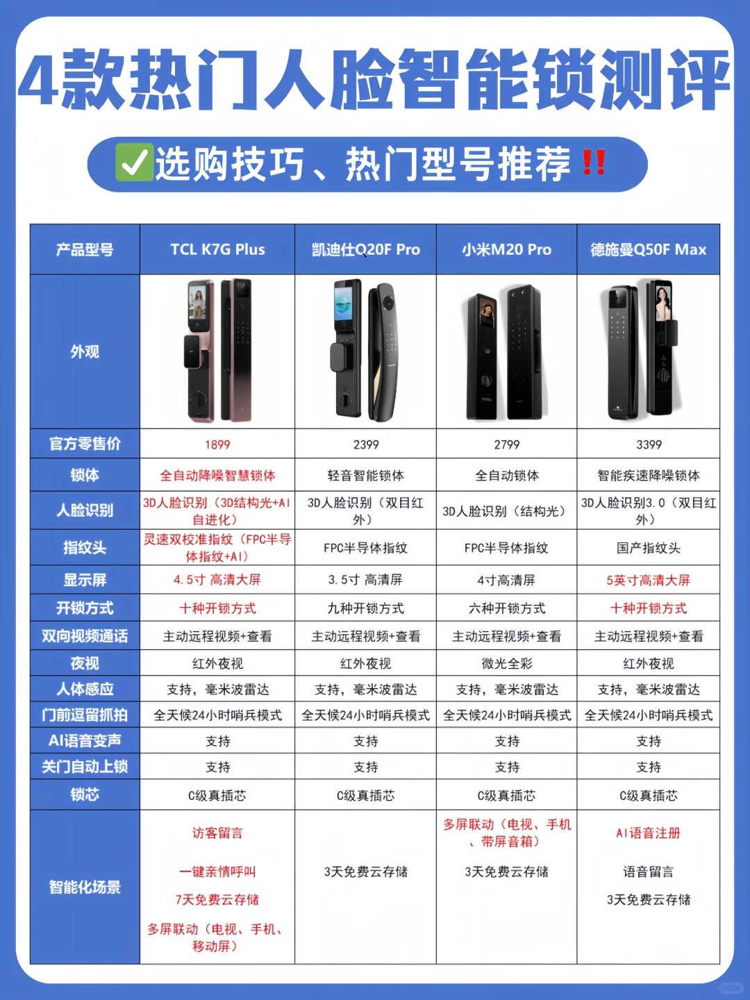 4款人脸识别智能锁优势各异,大家按需选择,具体差异看参数图。