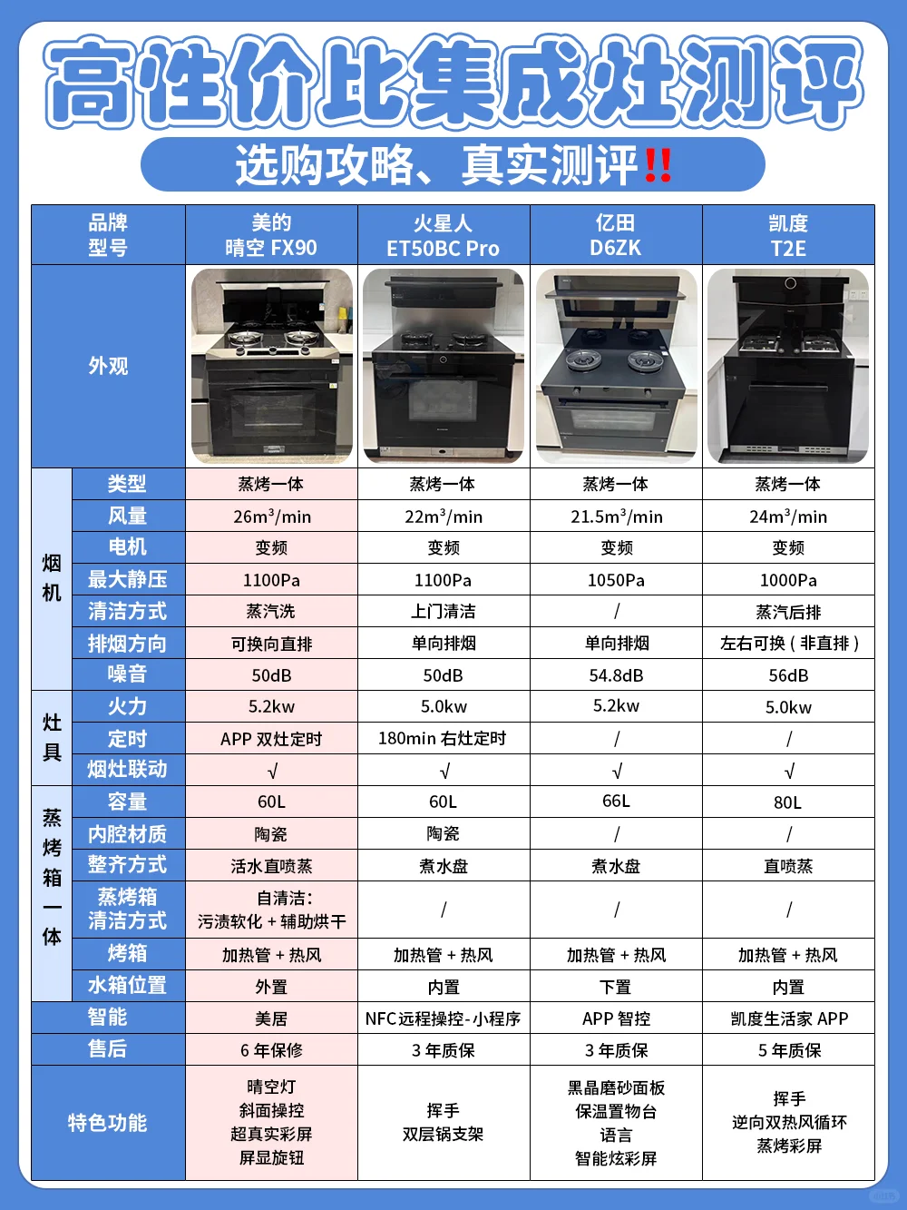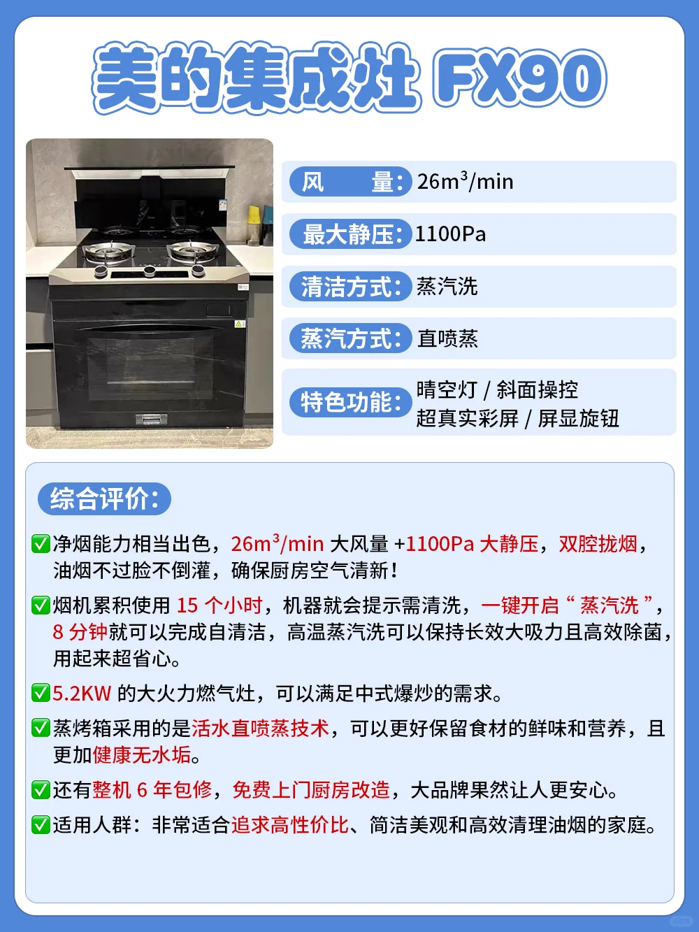 通过详细对比,我觉得美的晴空FX90集成灶性价比超高,26m³/min大风量+1100Pa大静压,双腔拢烟,油烟不过脸不倒灌,开放式厨房放心装!