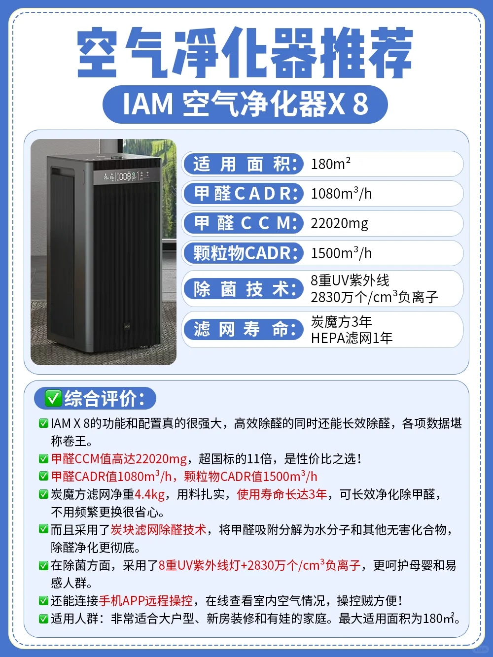 [斜眼R]经过筛选和对比,我觉得✨IAM空气净化器X8的功能和配置真的很强大,甲醛CADR、颗粒物CADR等各项参数堪称卷王,特别适合大户型家庭或商用。不仅除醛效率高,还能长效除醛3年!