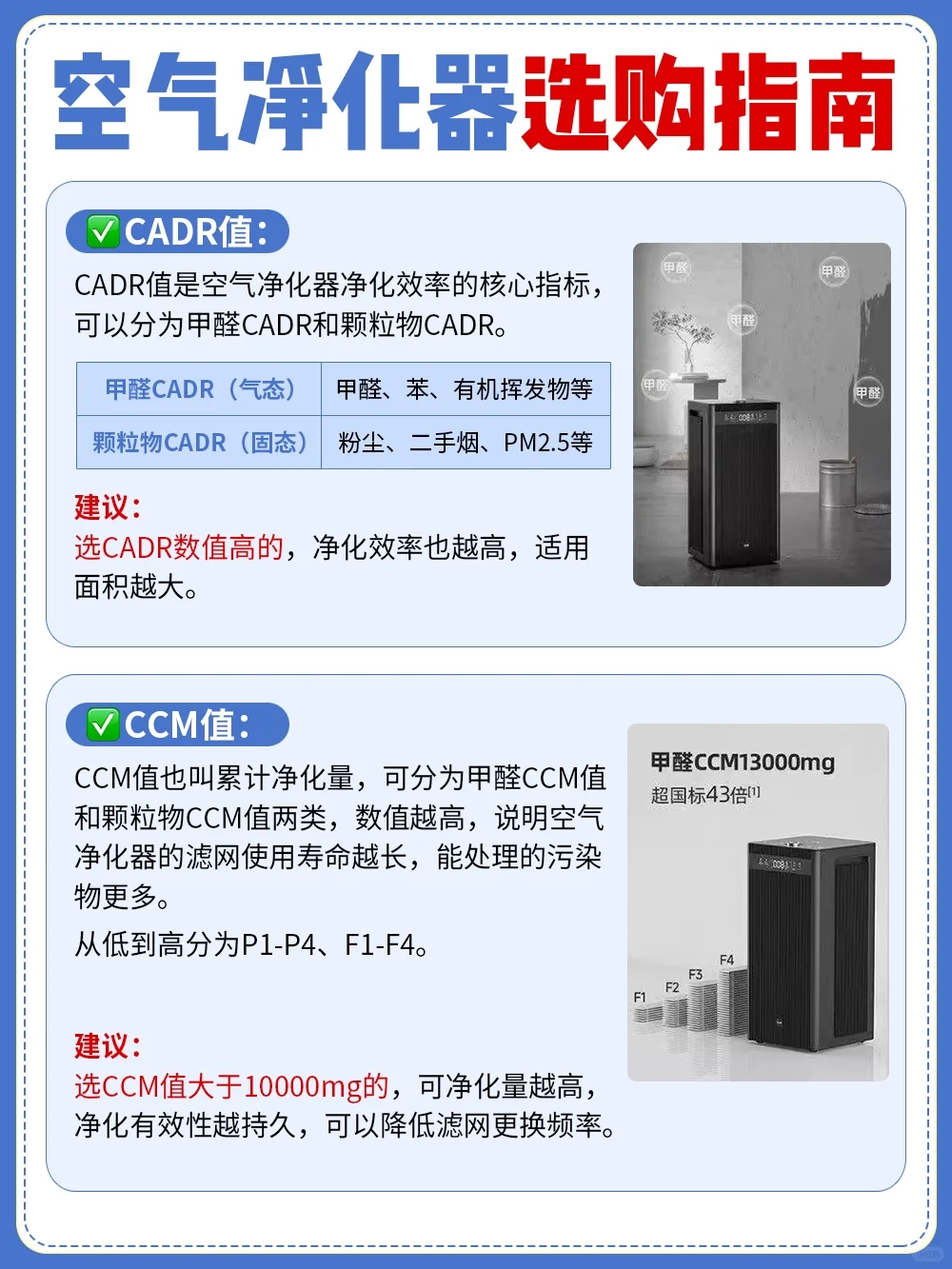 CADR建议选数值高的,净化效率也越高,适用面积越大