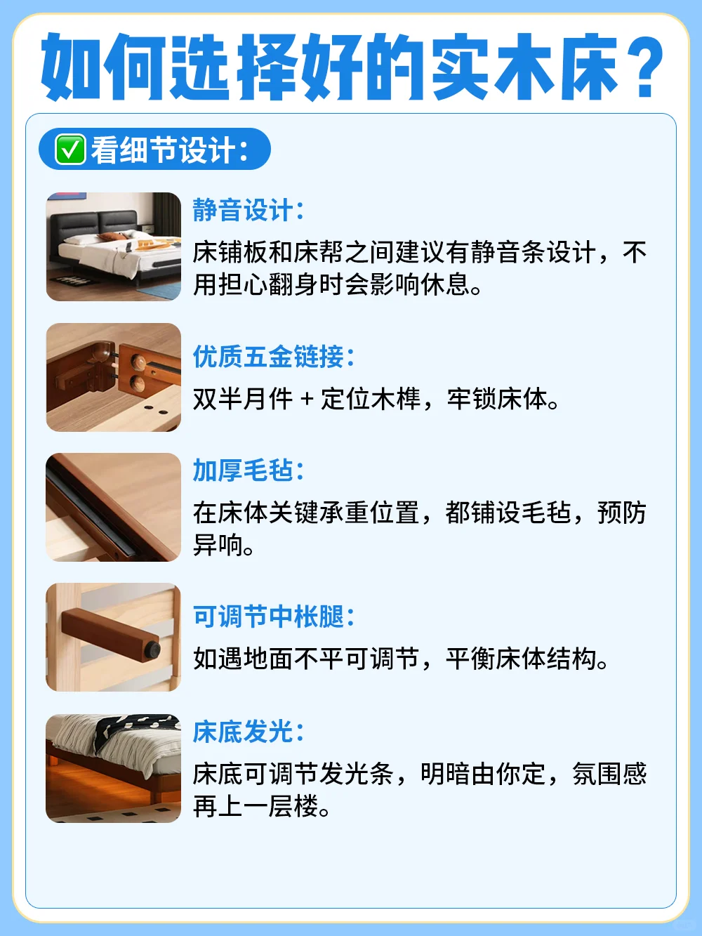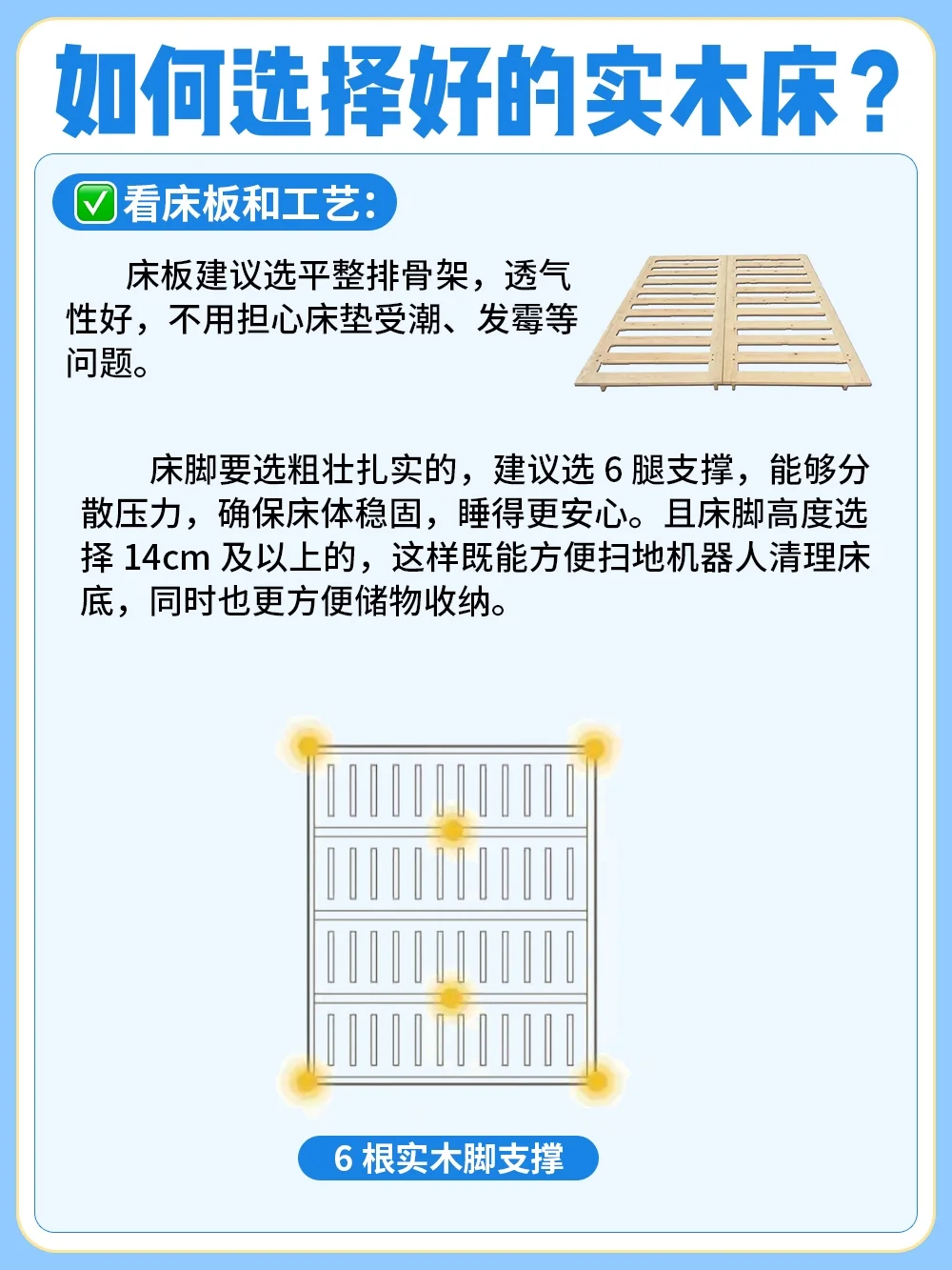 床脚要选粗壮扎实的,能够分散压力,确保床体稳固,睡得更安心。且床脚高度选择14cm及以上的,这样既能方便扫地机器人清理床底,同时也更方便储物收纳。