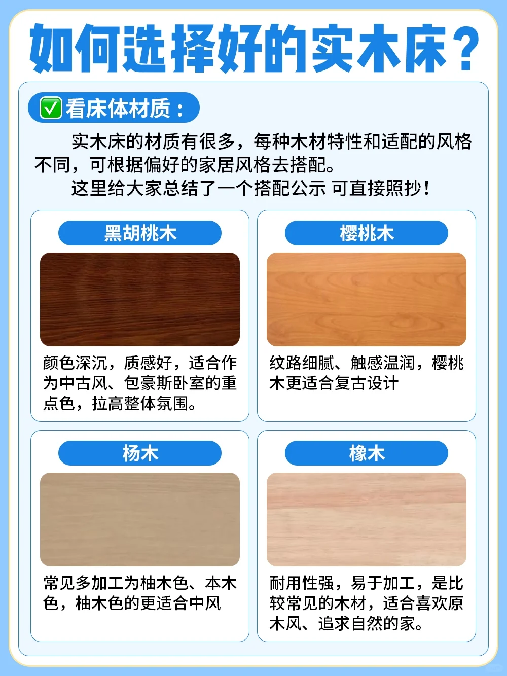 实木床的材质有很多,每种木材特性和适配的风格不同,可根据偏好的家居风格去搭配。