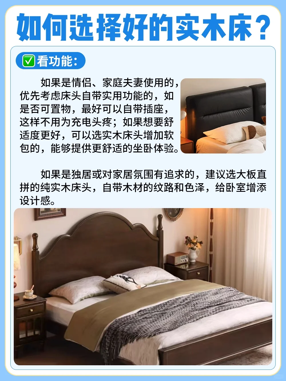 如果是情侣、家庭夫妻使用的,优先考虑床头自带实用功能的,如是否可置物,最好可以自带插座,这样不用为充电头疼;如果想要舒适度更好,可以选实木床头增加软包的,能够提供更舒适的坐卧体验。