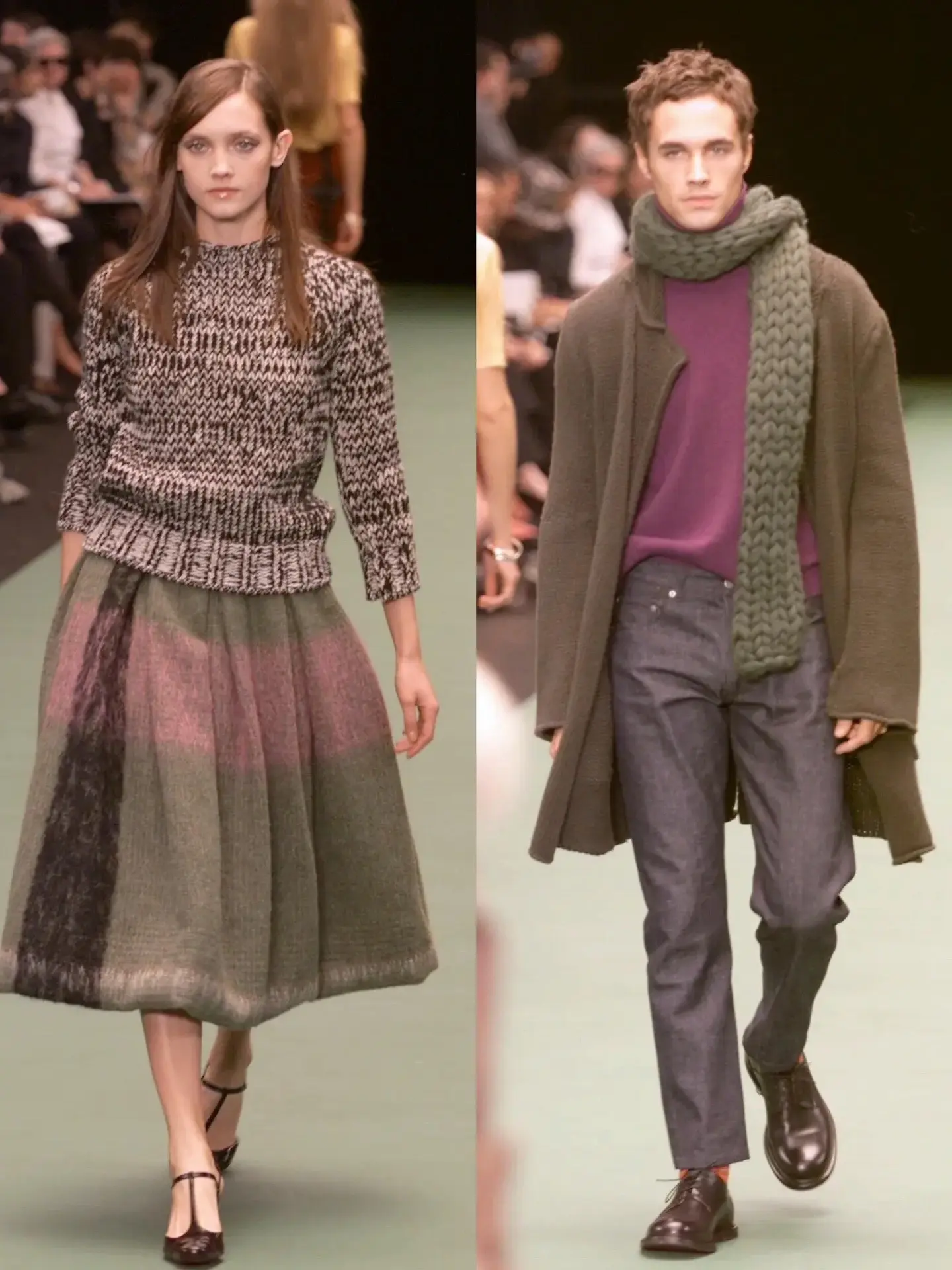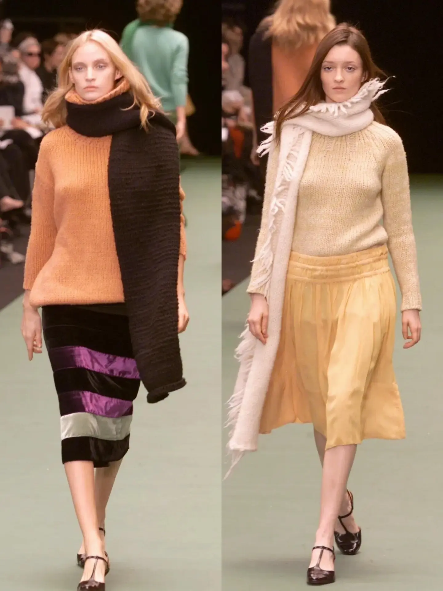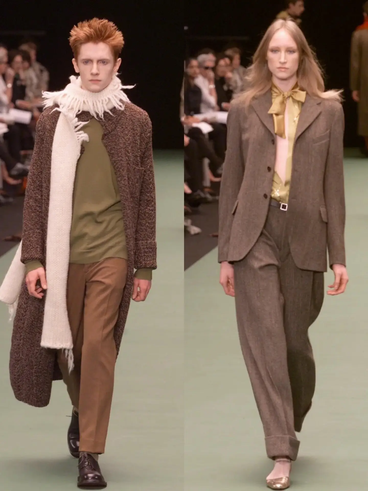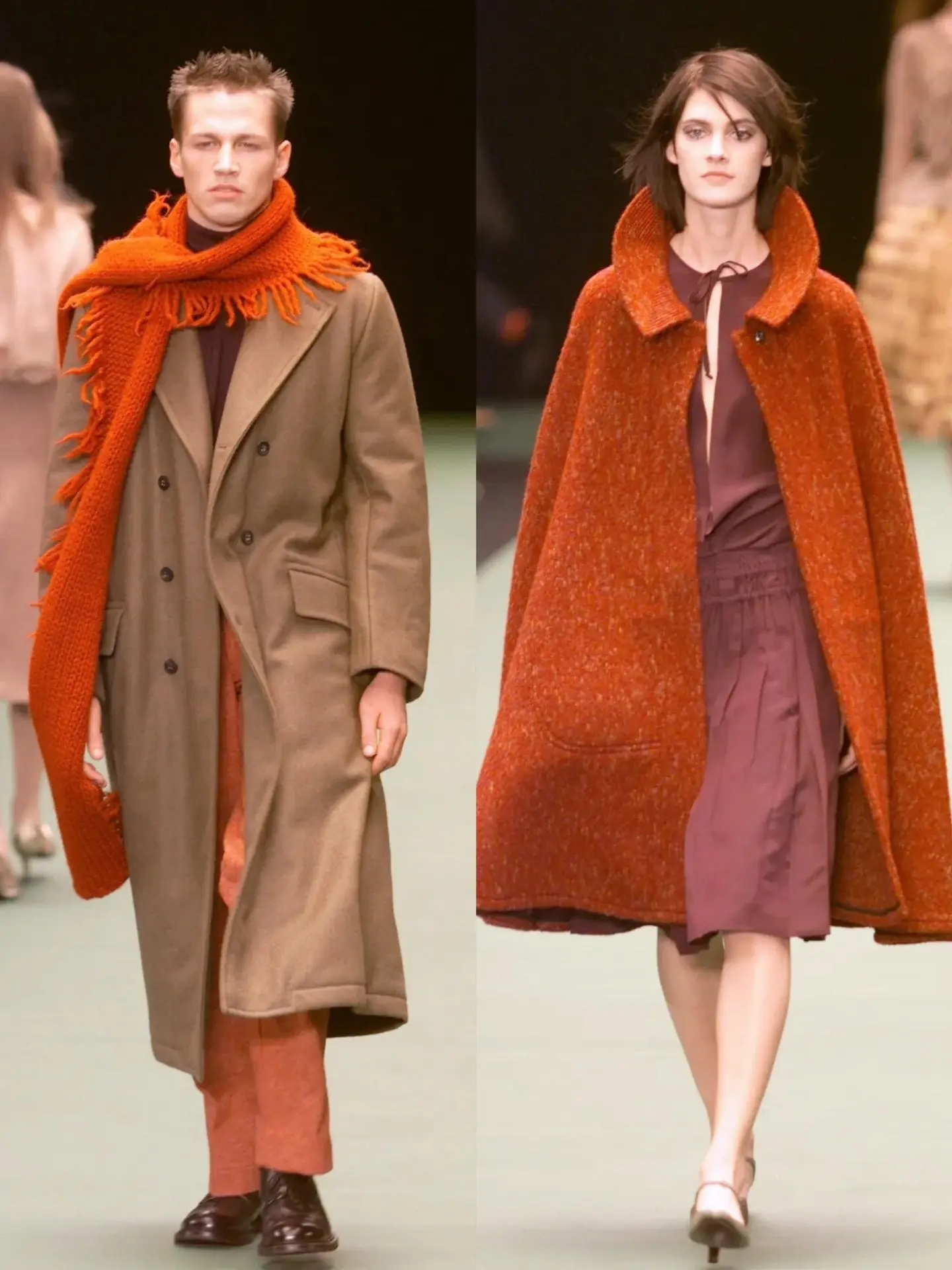 版型是基础的,搭配是简单的,长长的围巾绕于脖颈,有nerdy穿衣的随性感,也有时髦基因在线的配色美学。当材质与运色成为主角,任时光打磨总有美拉德回归时髦潮流的那一年。