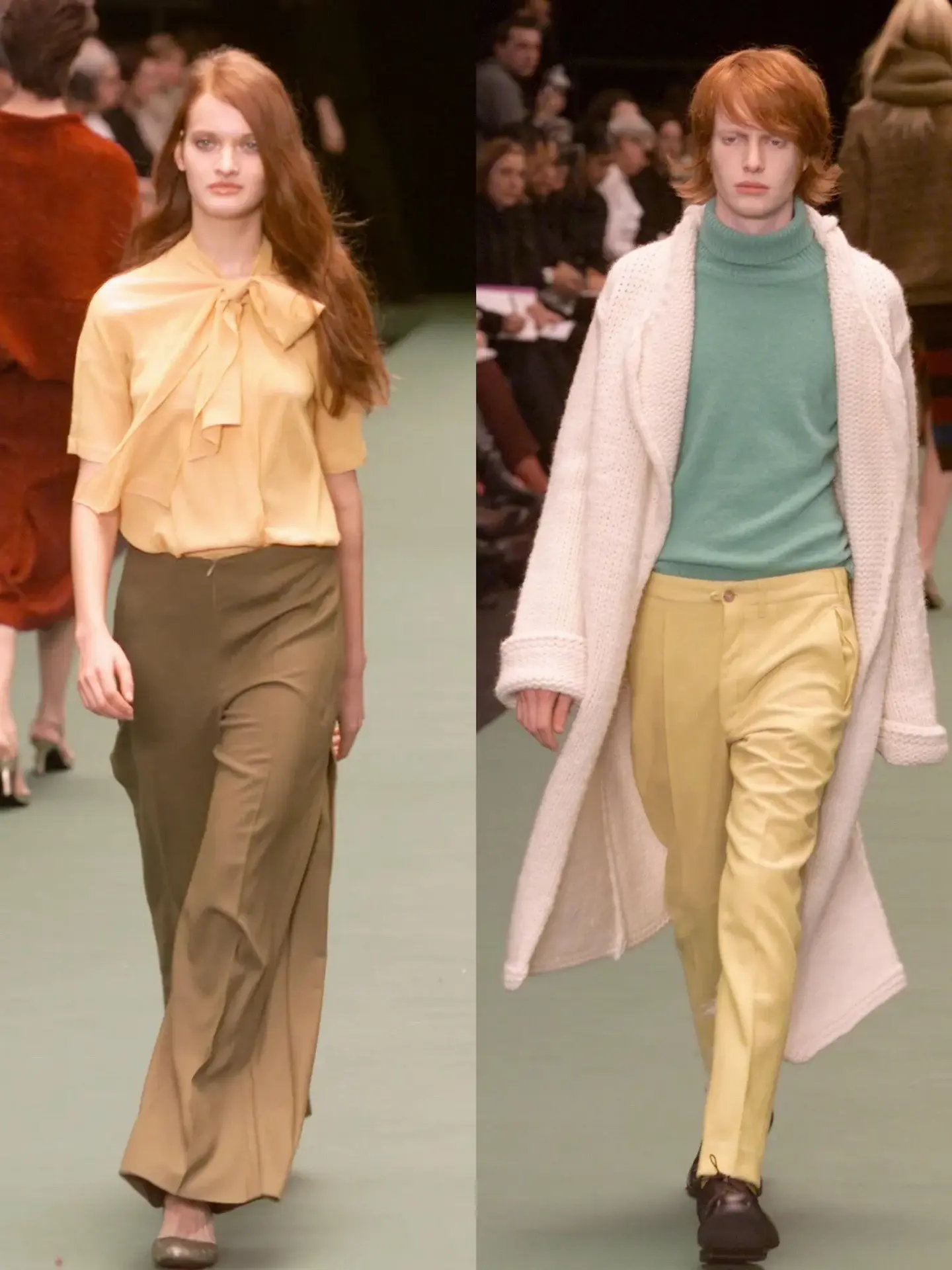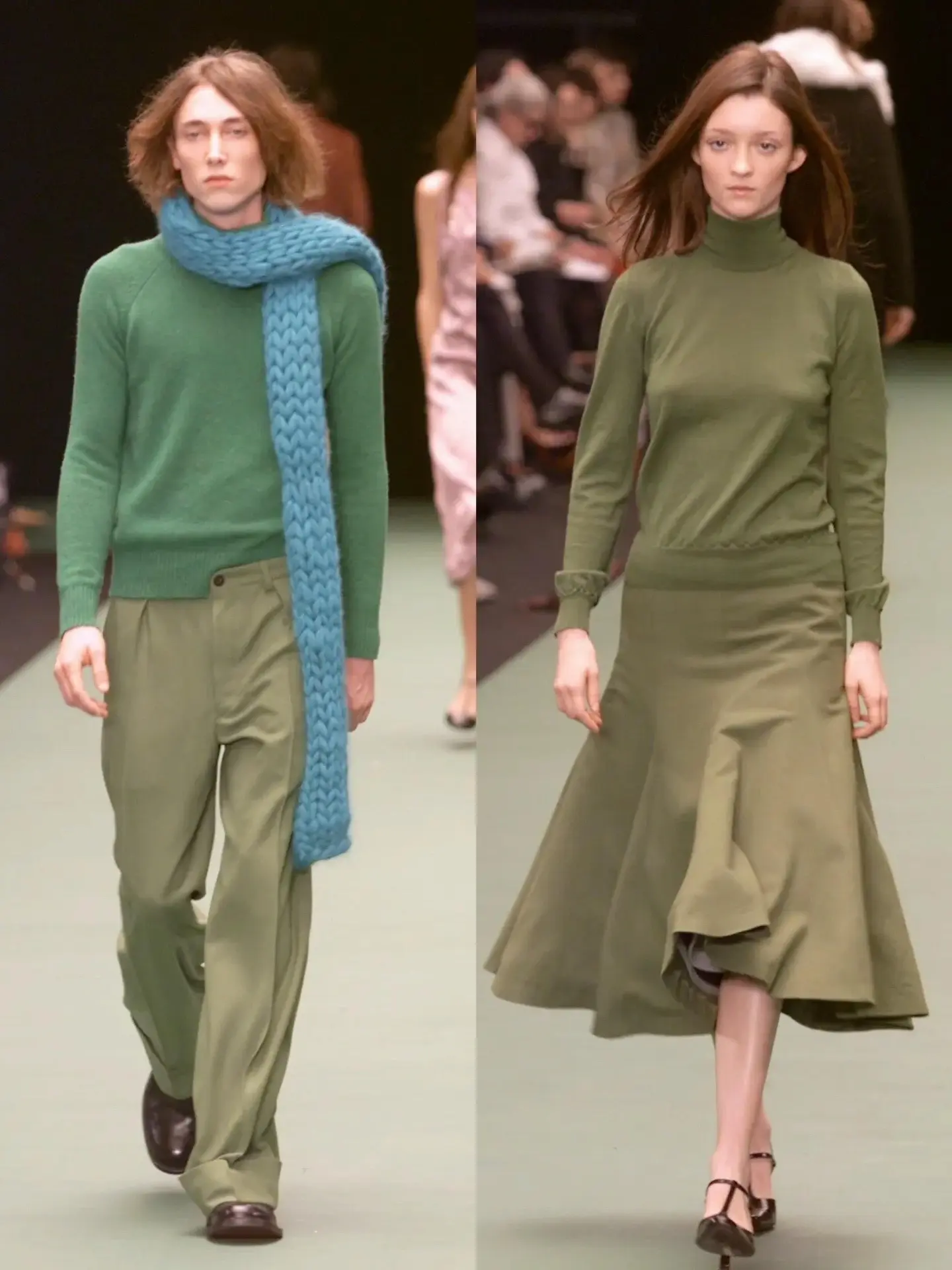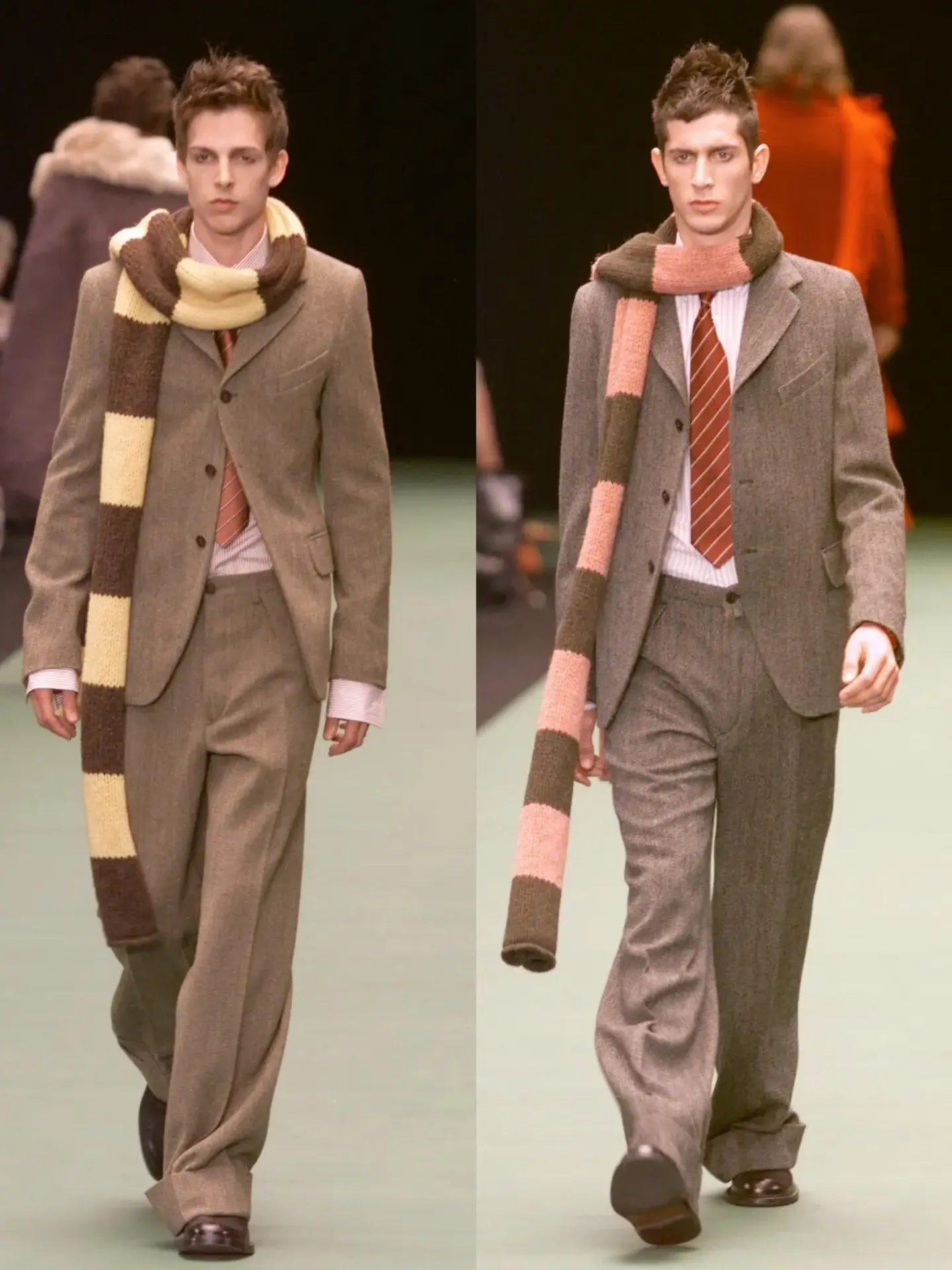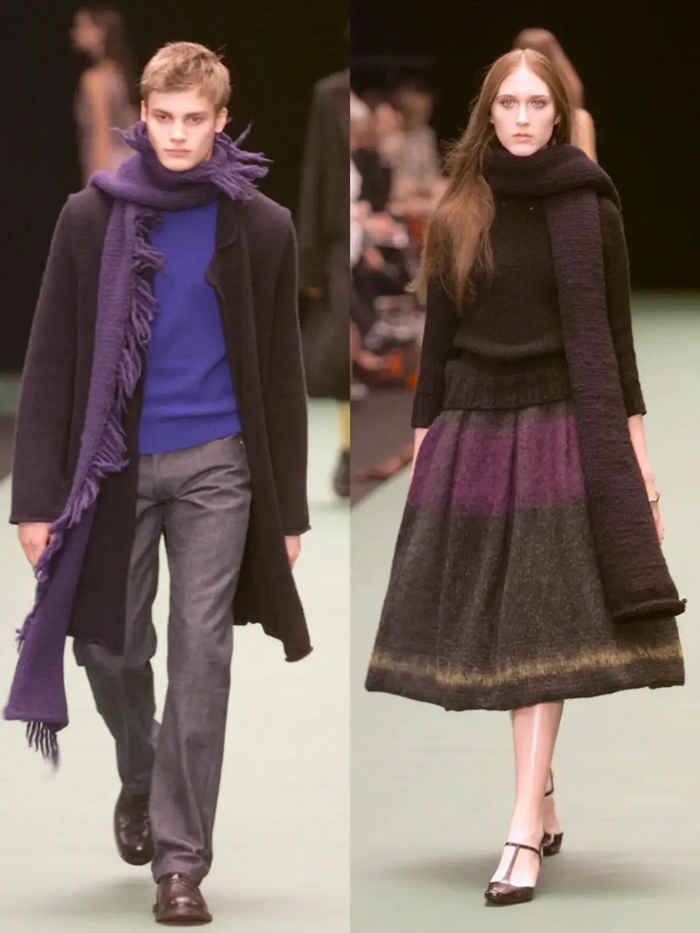 版型是基础的,搭配是简单的,长长的围巾绕于脖颈,有nerdy穿衣的随性感,也有时髦基因在线的配色美学。当材质与运色成为主角,任时光打磨总有美拉德回归时髦潮流的那一年。