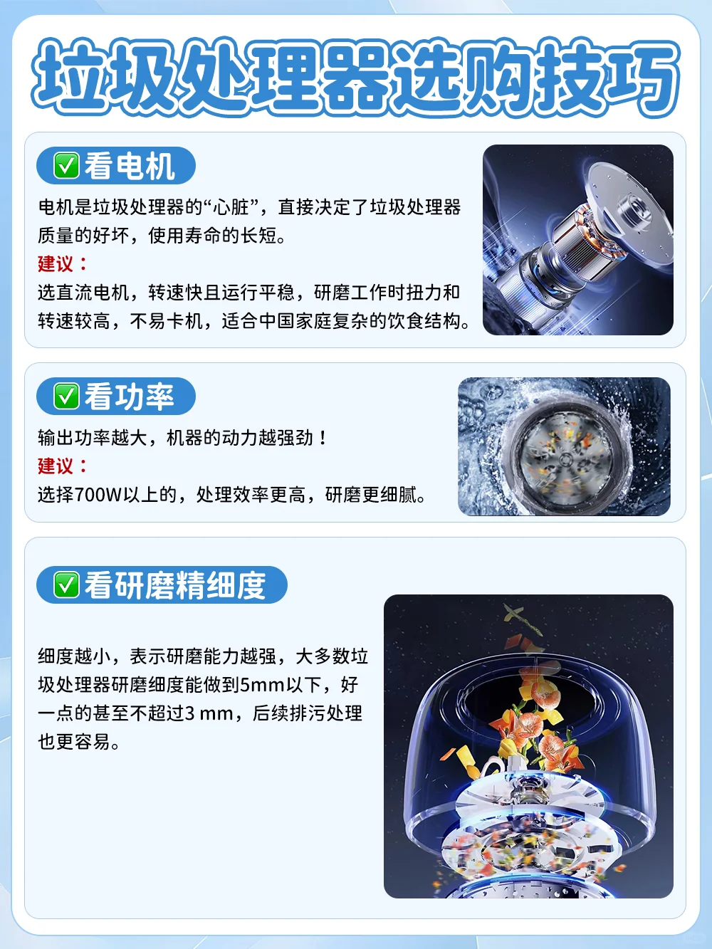 处理垃圾的速度特别快,800W强悍直流一体式电机,搭配上6重精细研磨,能快速把垃圾研磨成3mm以下的细小颗粒,就算是骨头、鱼刺、蔬菜等都能轻松磨碎冲走。