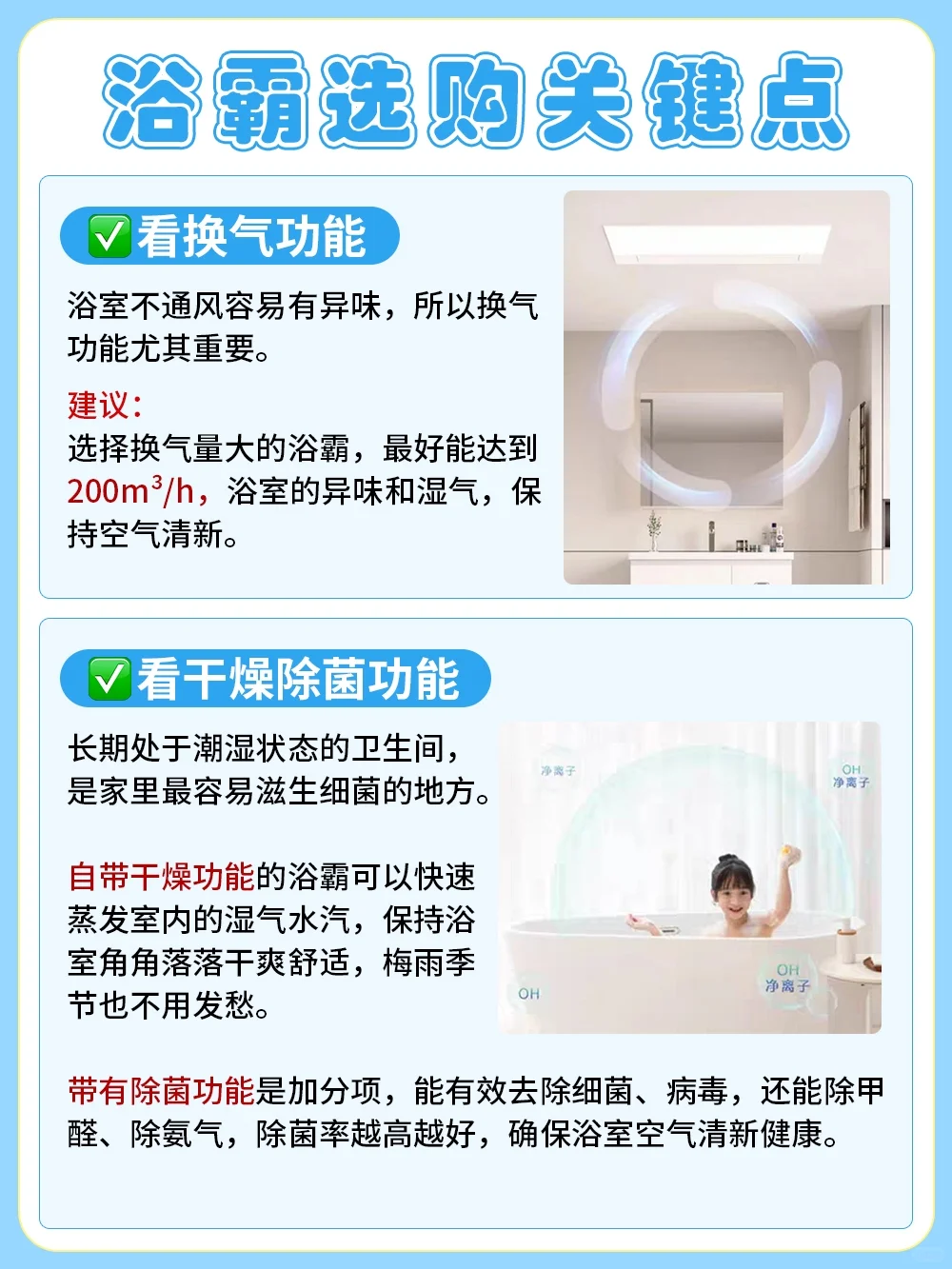✅220m³/h超大换气量+智能干燥功能+OH净离子除菌技术,保持浴室空气清新,有效除臭除湿除菌抑病毒,除菌率99.9%,打造健康沐浴环境。