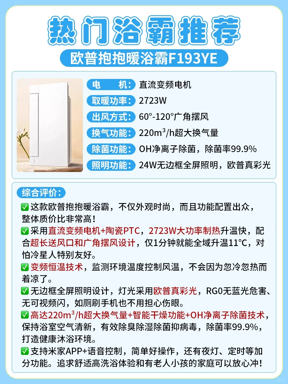 [斜眼R]综合以上9大选购技巧,也了解了市面上较火的3款浴霸,最终选择了欧普抱抱暖浴霸,它不仅外观时尚,功能配置出众,整体质价比非常高!