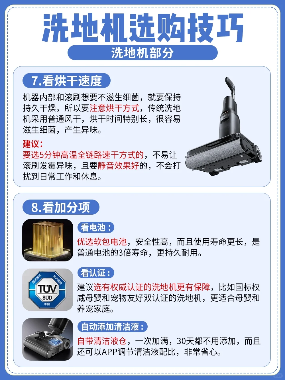 建议选有权威认证的洗地机更有保障,比如国标权威母婴和宠物友好双认证的洗地机,更适合母婴和养宠家庭。