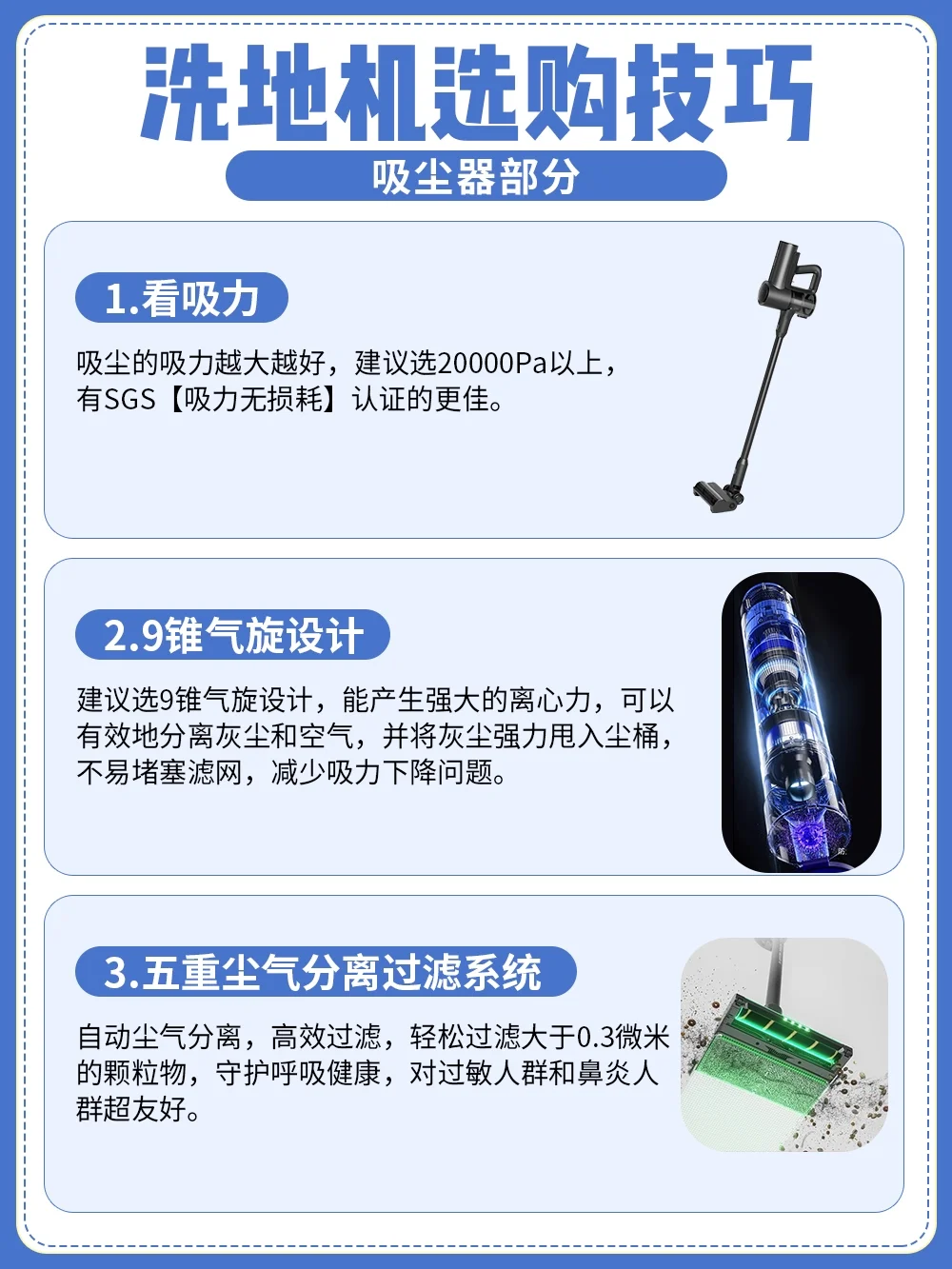 吸尘的吸力越大越好,建议选20000Pa以上,有SGS【吸力无损耗】认证的更佳。