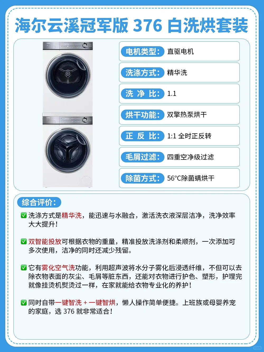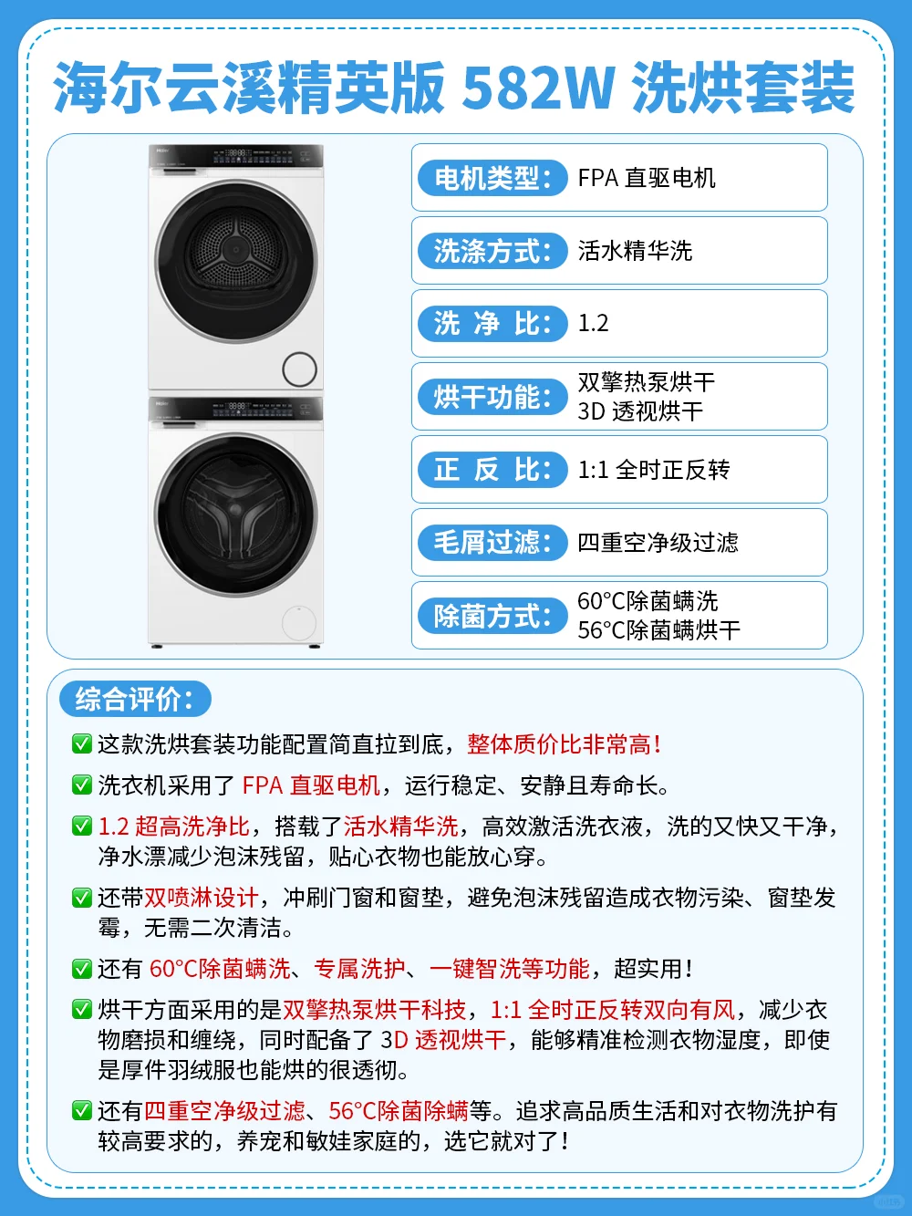 ✅活水精华洗、洗净比1.1、智能投放、热泵低温柔烘、56℃除菌螨烘干