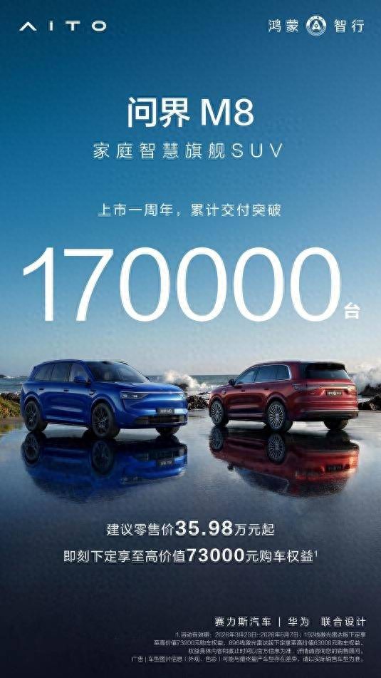 上市一年,交付突破17万辆!“家庭智慧旗舰SUV”问界M8迎来新的里程碑。