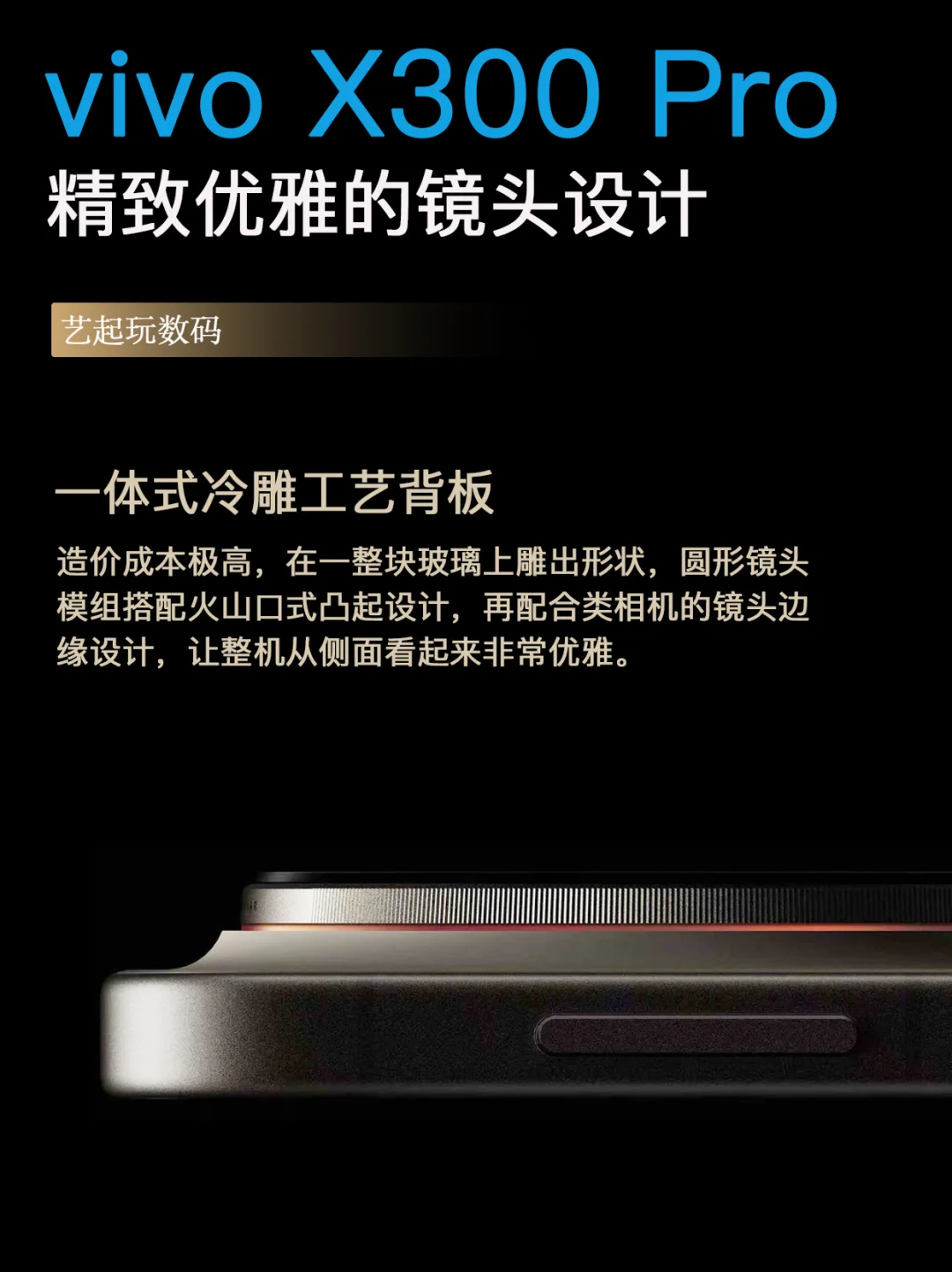 17PM这次用了铝金属一体式机身+玻璃拼接,大家都在吐槽丑,X300 Pro今年在颜值方面估计赢麻了,还是采用圆形的镜头模组设计,这次用一体式冷雕工艺制作玻璃背板,再加上类似相机镜头的设计,精致感和美感很好的融合到了一起。