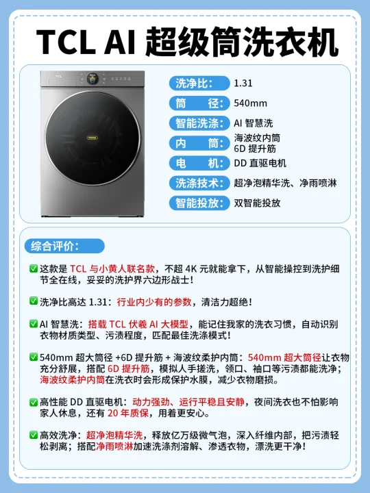 [斜眼R]对比下来,三款机型各有优势,但TCL AI超级筒洗衣机在洗净力、AI智慧洗、护衣效果上更符合我对洗衣机的要求,主要是人家质价次高啊,综合实力更能打,闭眼入不亏!