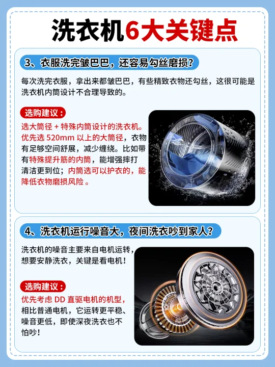 ✅ 内筒技术:别只看容量,筒径大小和内筒设计更关键。优先选520mm以上的大筒径,衣物舒展不缠绕。