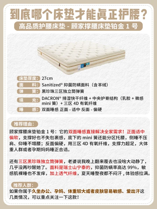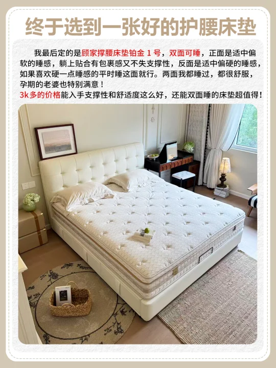 经过多方面对比,我重点推荐顾家撑腰床垫铂金1号。
