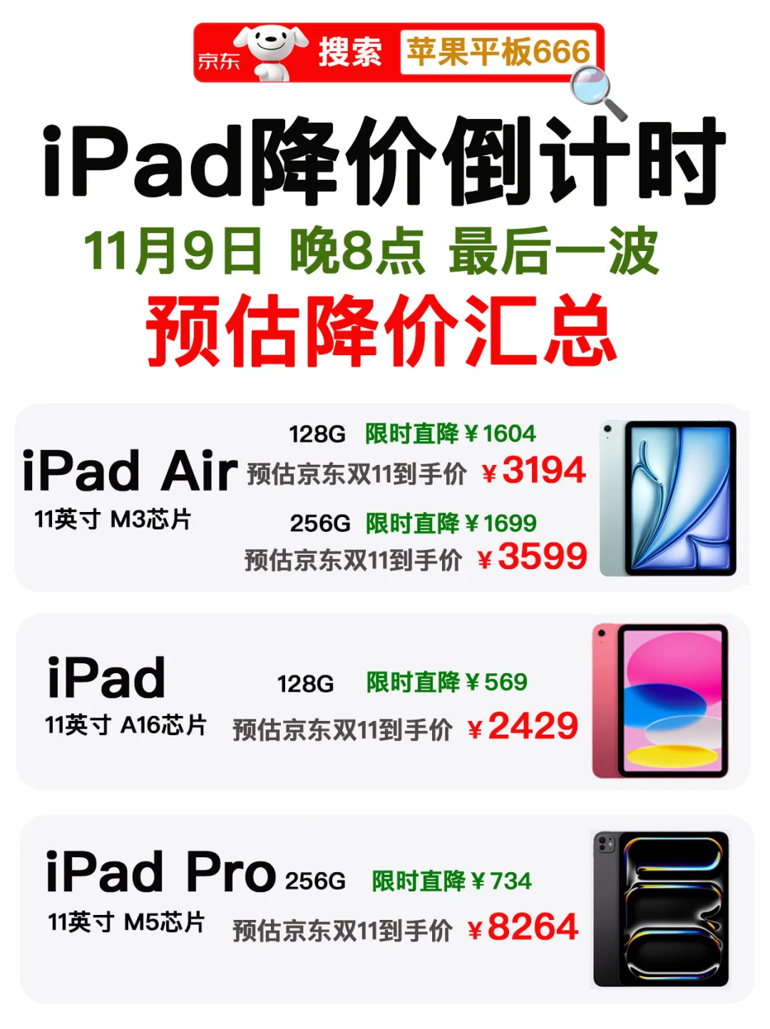 京东是真卷价格,9号晚上8点也是最后一波了,后面不会有这样的好价格了,而且这些降价是限时的数量也有限,想入手iPad的9号晚上8点就在京东App🔍【苹果平板666】,iPad全系都是好价,值得入手!