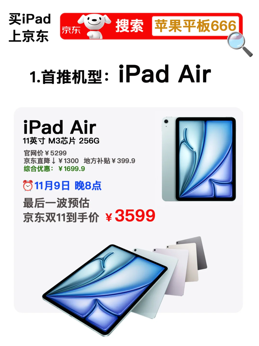 今年的iPad全系列,我比较推荐4个型号1️⃣ iPad Air 256G💰原价5299,✅最后一波预计到手💰3549