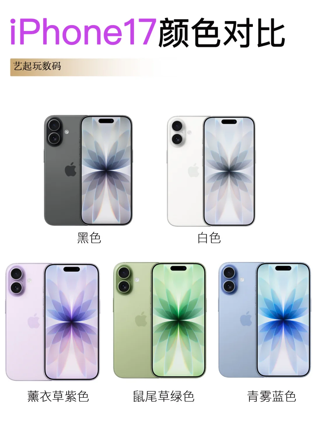 iPhone17:薰衣草紫、鼠尾草绿、青雾蓝、白、黑