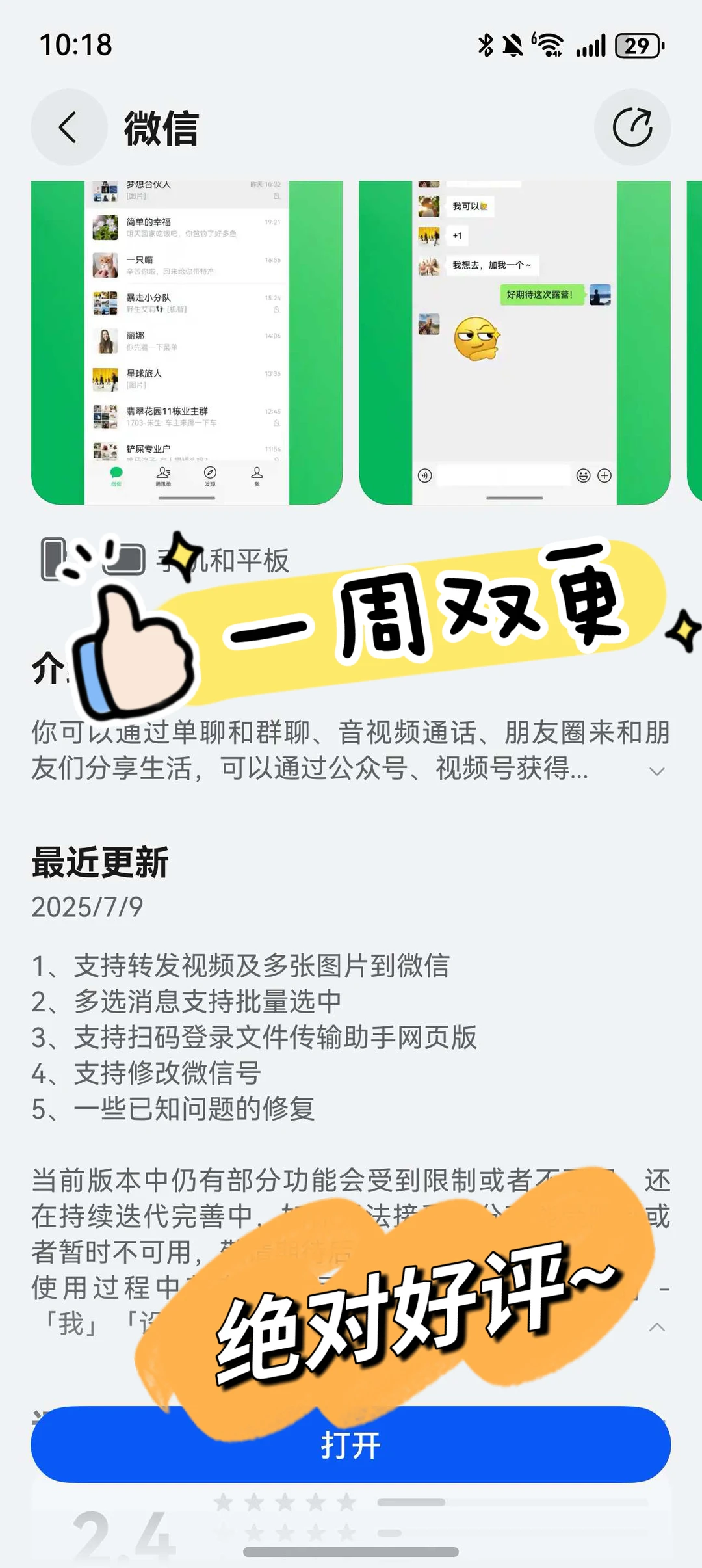 新版本的微信已经上架华为应用市场,更新后处理工作的效率直接起飞:给客户传方案时,视频和照片能一起发,再也不用先传文档再补视频,对方都说 “比以前专业多了”。部门群里找上周的会议记录,批量选中功能再也不用翻聊天记录翻到手指酸,框选一下全搞定,每天至少省出10分钟摸鱼时间~