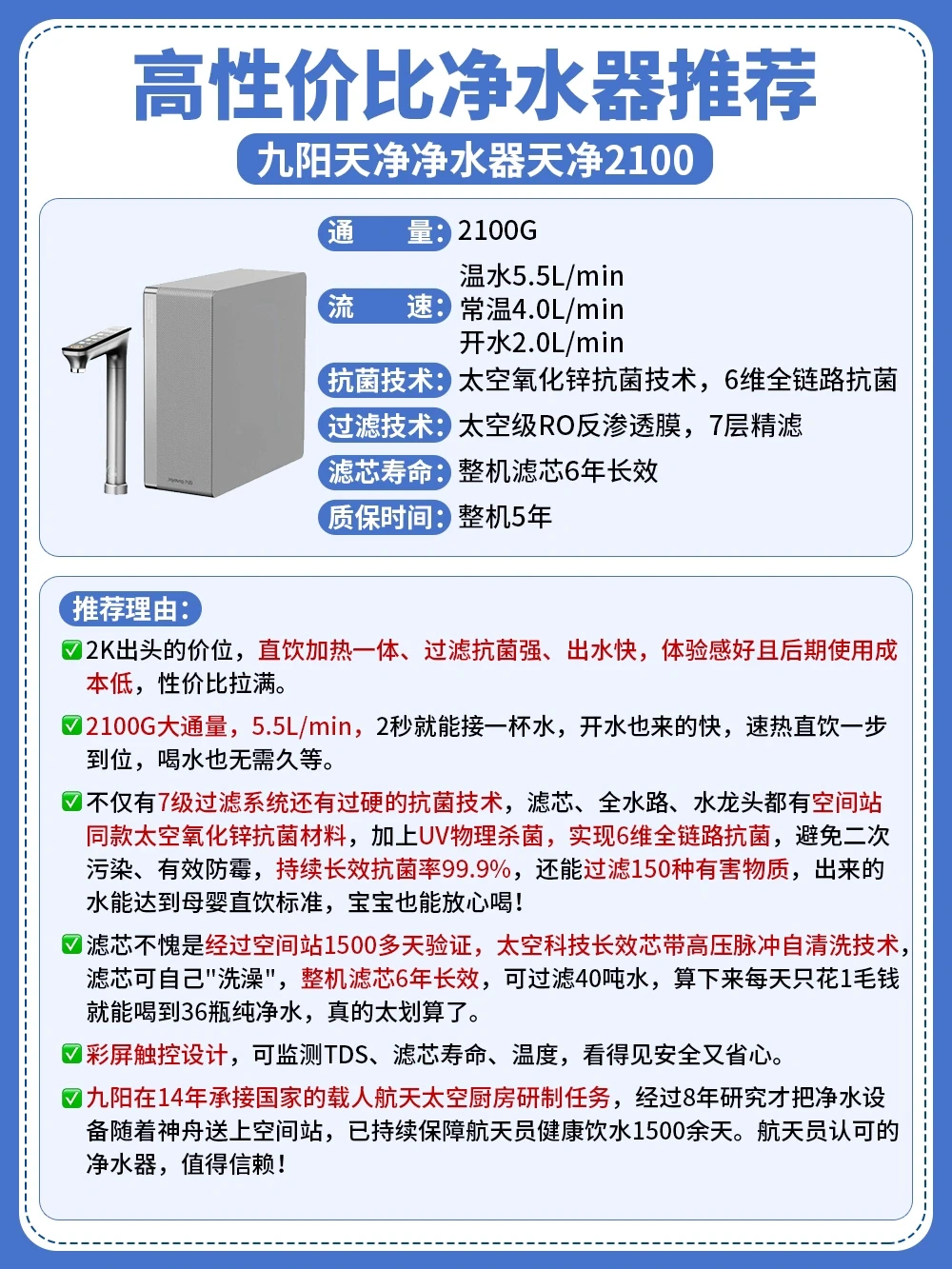 九阳可是国民大品牌,在太空中的航天员提供了1500多天的净热水,品质完全不用担心。