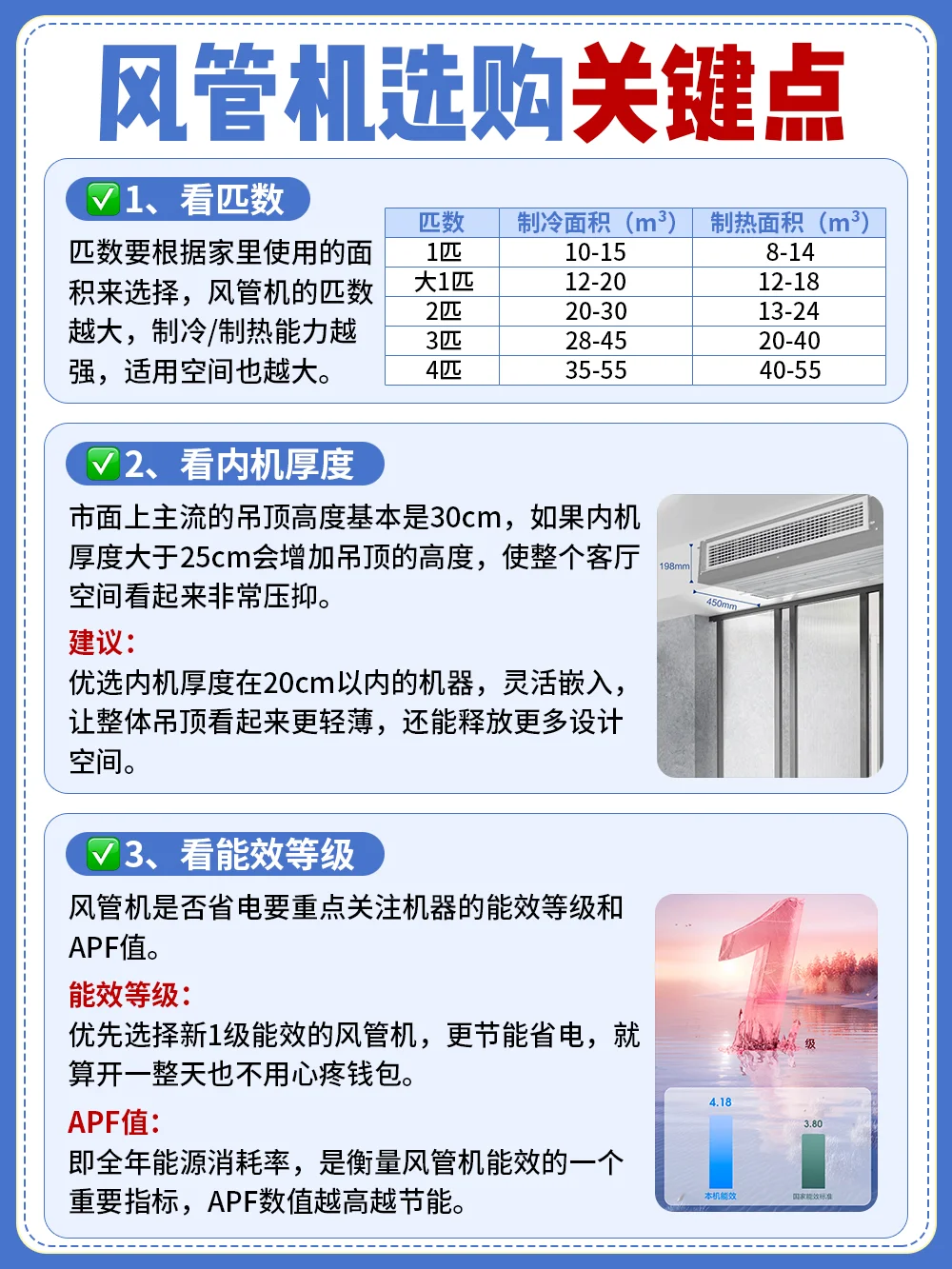 优先选择新1级能效和APF值高的风管机,更节能省电。