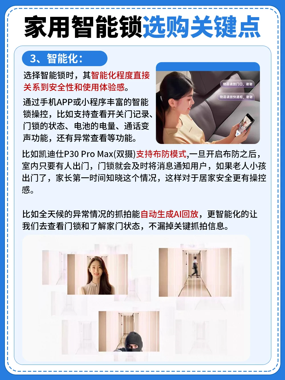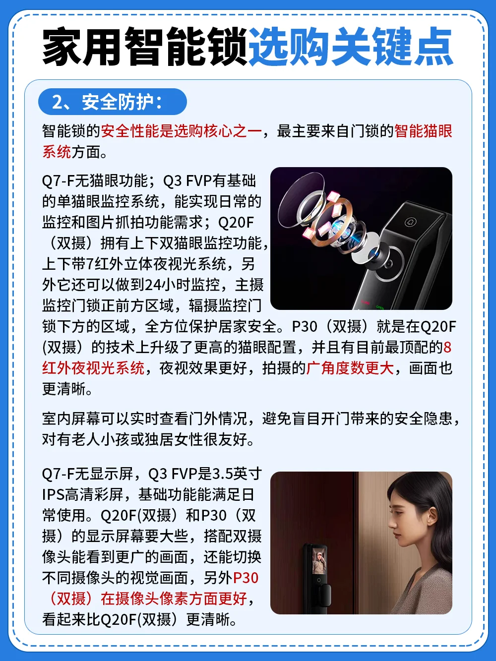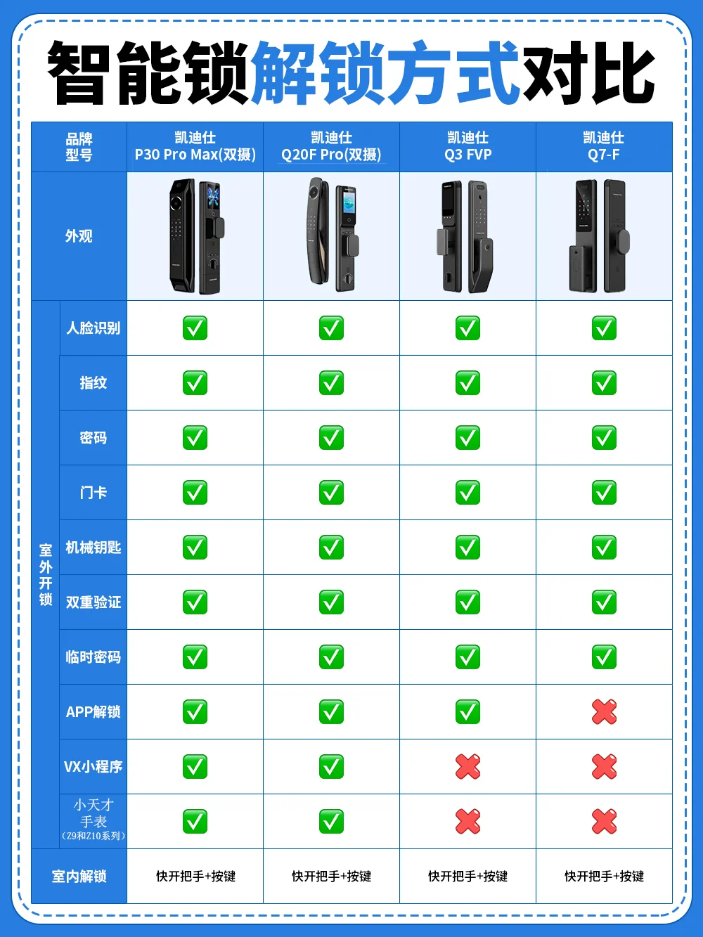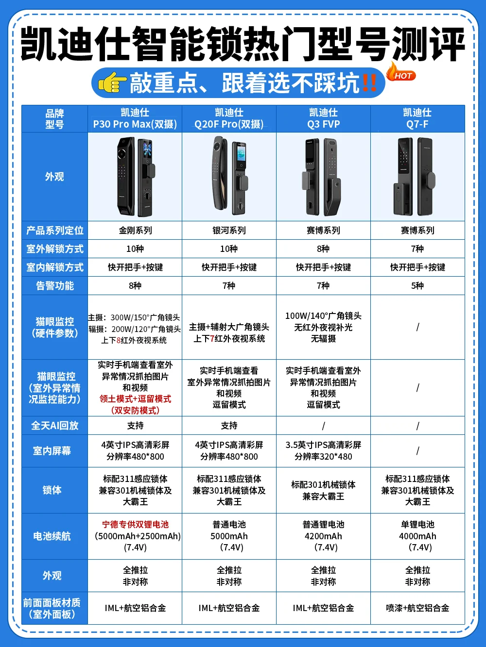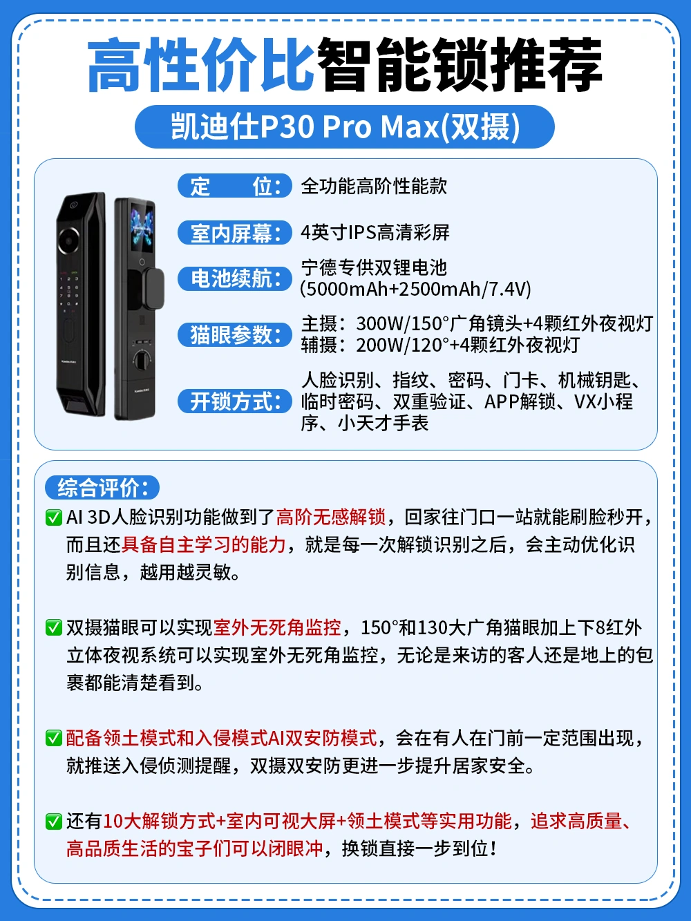 ▶️凯迪仕P30 Pro Max(双摄):全功能高阶性能款,功能颜值全拉满,双摄猫眼加上下8红外夜视系统,还配备了双安防模式,进一步提升居家安全,配备了双电池,轻松解决电量焦虑,追求高质量、高品质生活的宝子们可以闭眼冲,换锁直接一步到位!