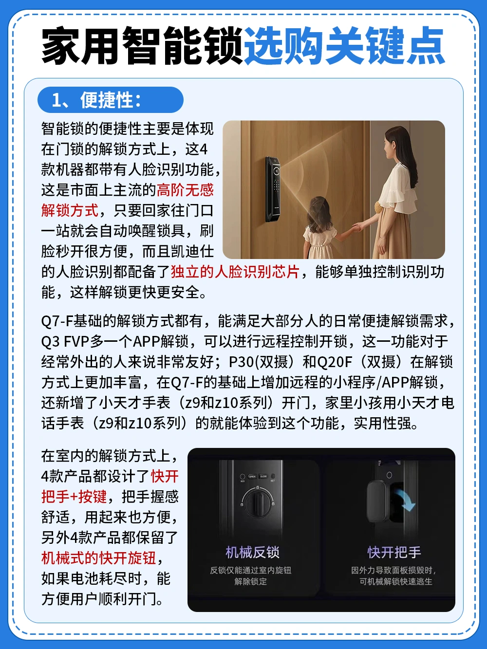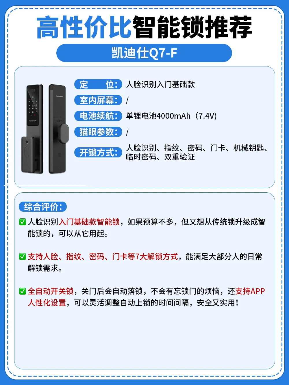 ▶️凯迪仕Q7-F:如果预算不多,但又想从传统锁升级成智能锁的,可以从它用起,7大解锁方式,能满足大部分人的日常解锁需求,标配感应锁体和大霸王,第一次用智能锁放心入!